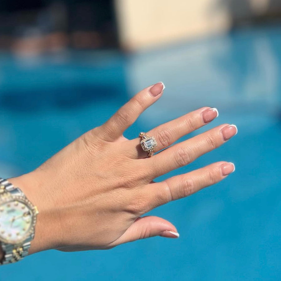 Presenting our gorgeous 1.00ct+ IGI Certified Centre Lab-Grown Emerald Cut Lab Diamond Engagement Ring set on a stunning Cathedral Setting with a braided spiral diamond shoulder and adorned with a diamond halo.