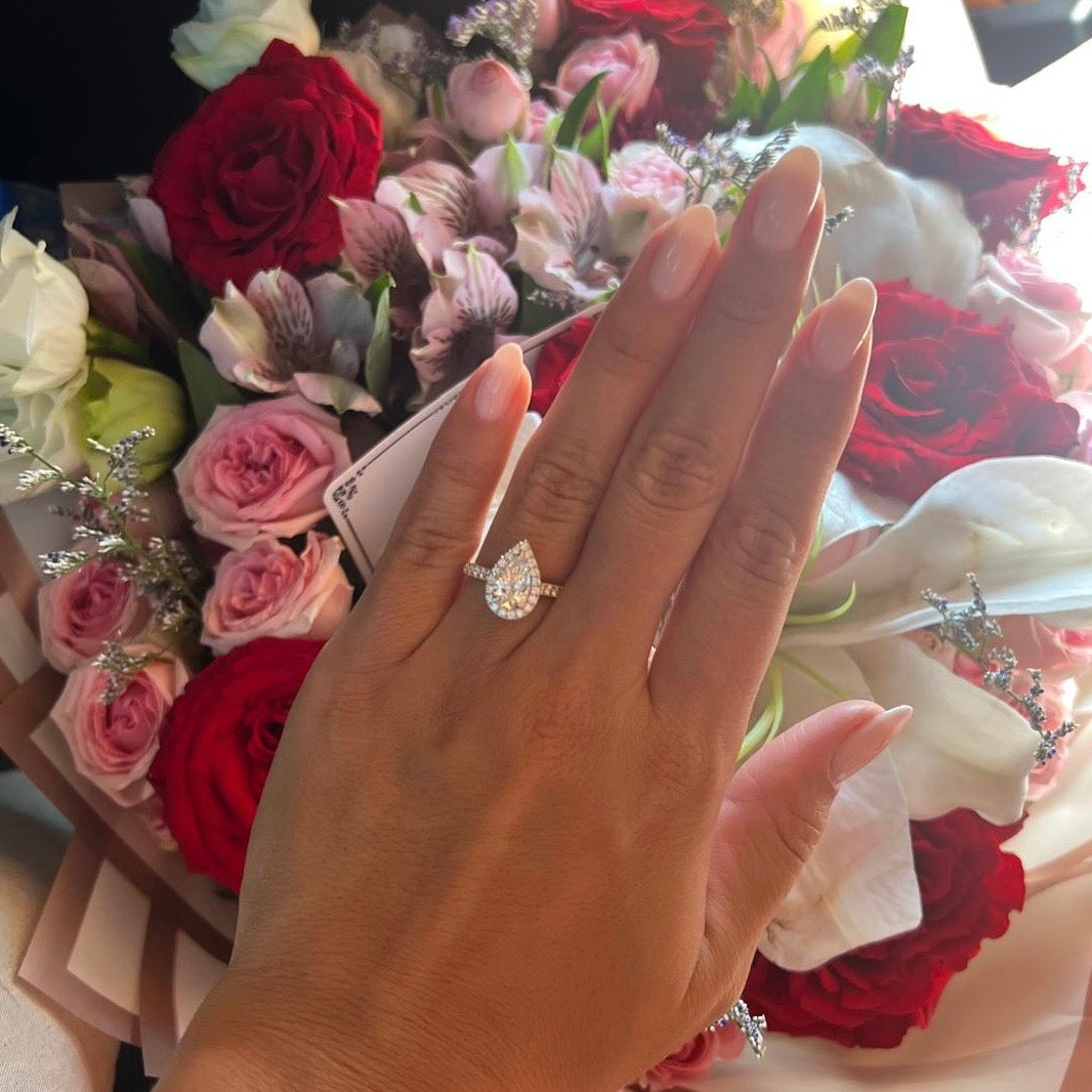 Presenting our gorgeous 0.50ct+ IGI Certified Centre Lab-Grown Pear Brilliant Cut Lab Diamond Halo Engagement Ring set on a stunning Cathedral Setting adorned with a halo.