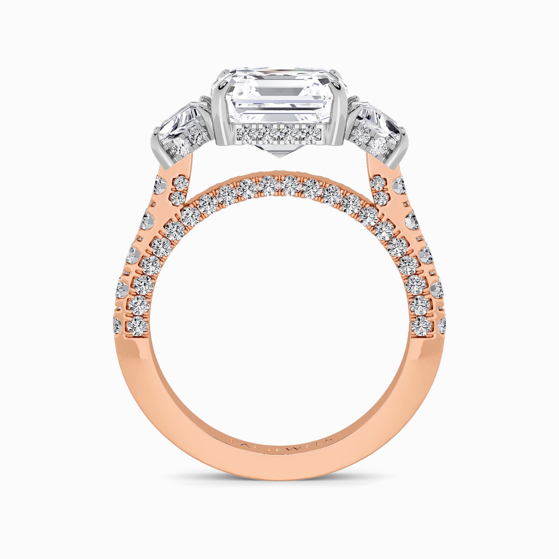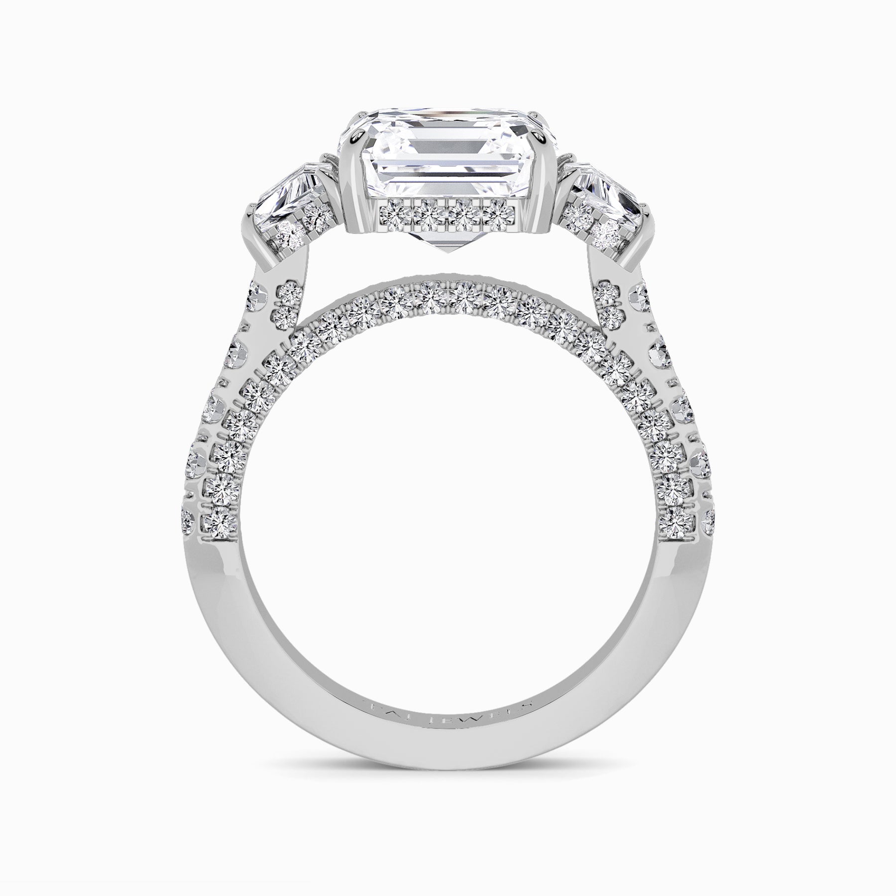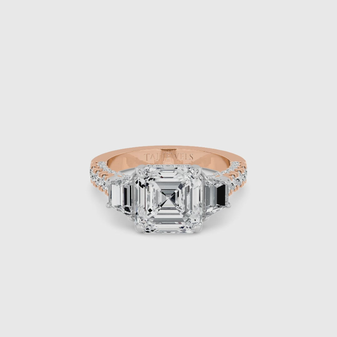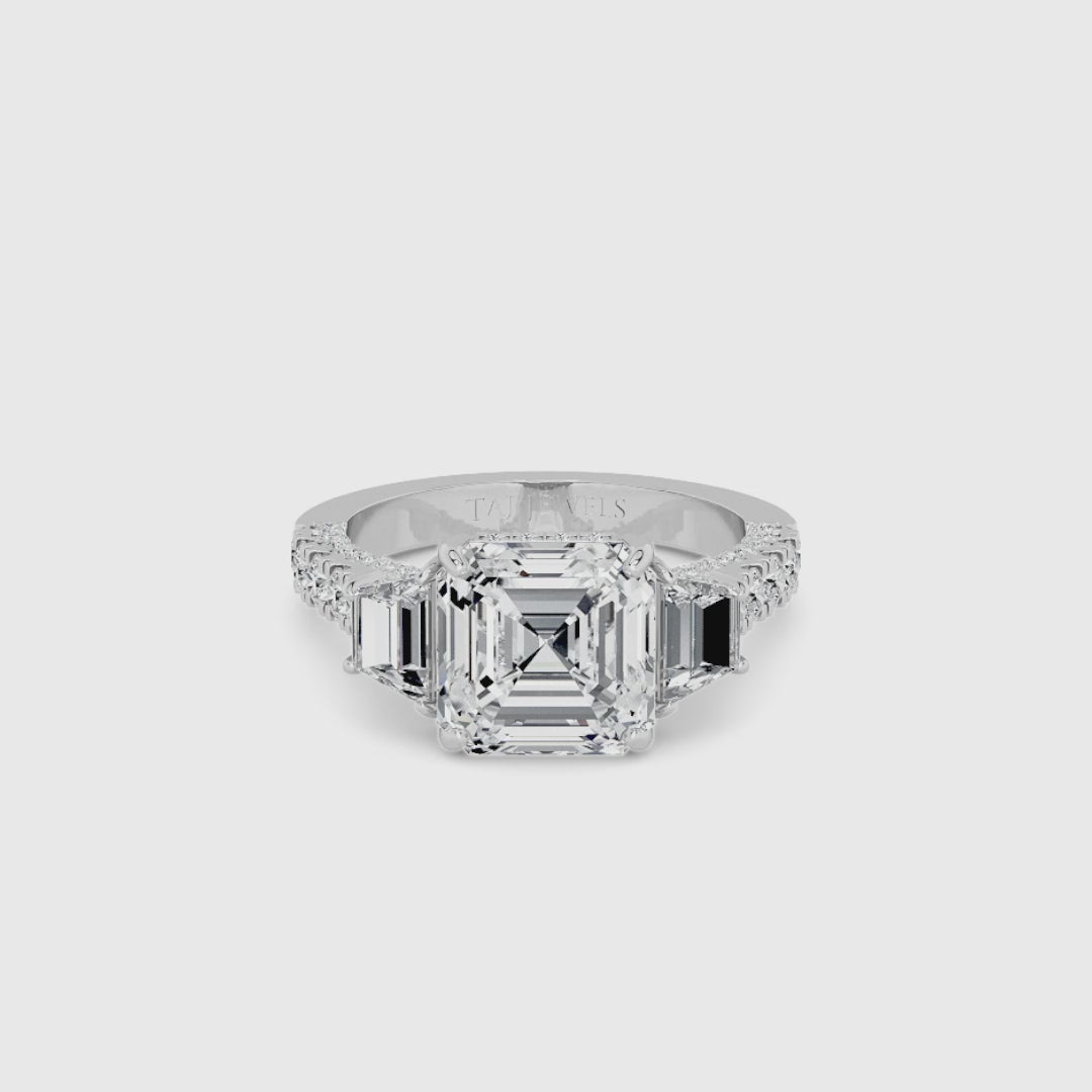 A striking expression of timeless sophistication, this 1.50ct+ Asscher cut lab diamond engagement ring is designed to captivate from every angle. The centre stone is elegantly framed by two trapezoid-cut side diamonds, while the elevated setting showcases a beautiful open gallery adorned with 3D pave band. Beneath the centre stone, a discreet diamond-set halo enhances depth, brilliance, and architectural interest without detracting from the centre diamond’s overall presence.