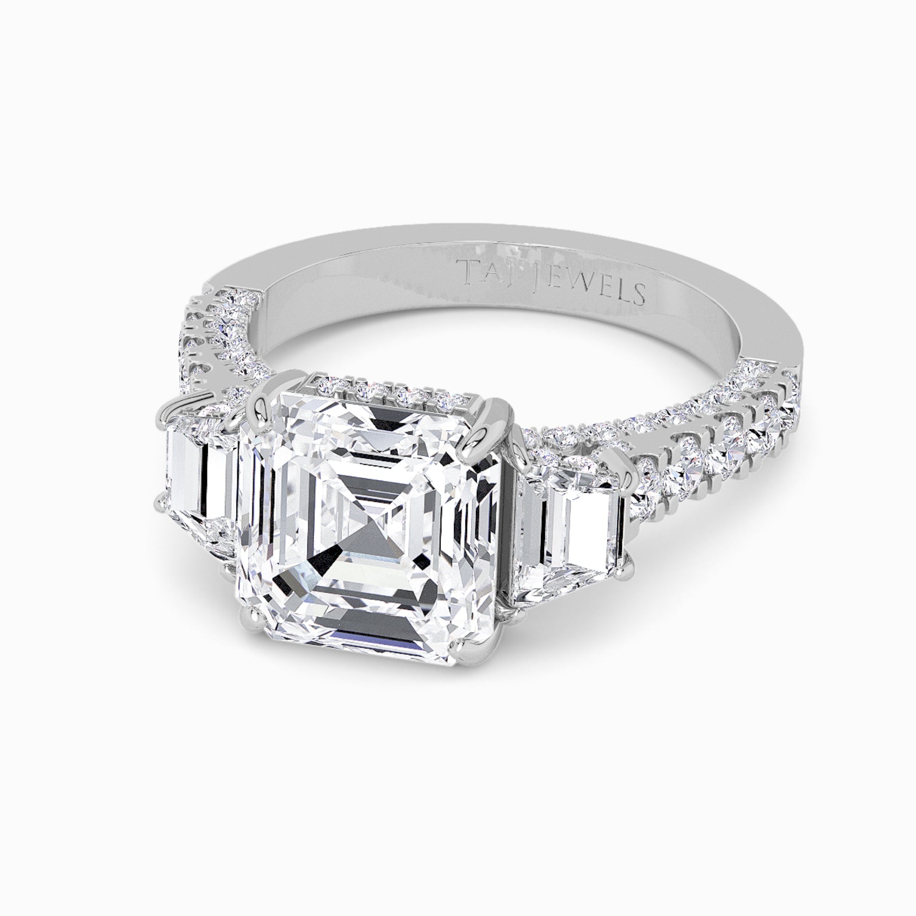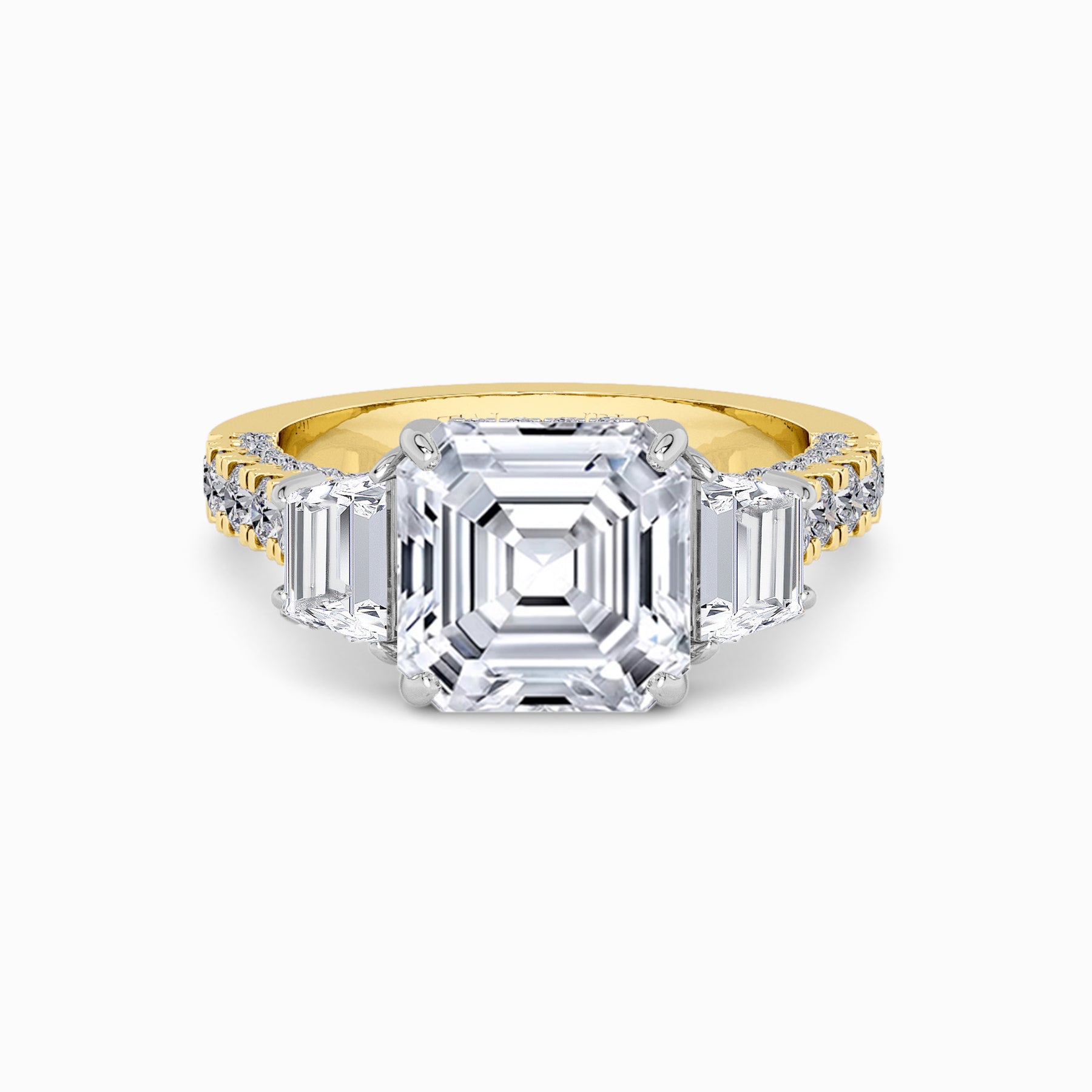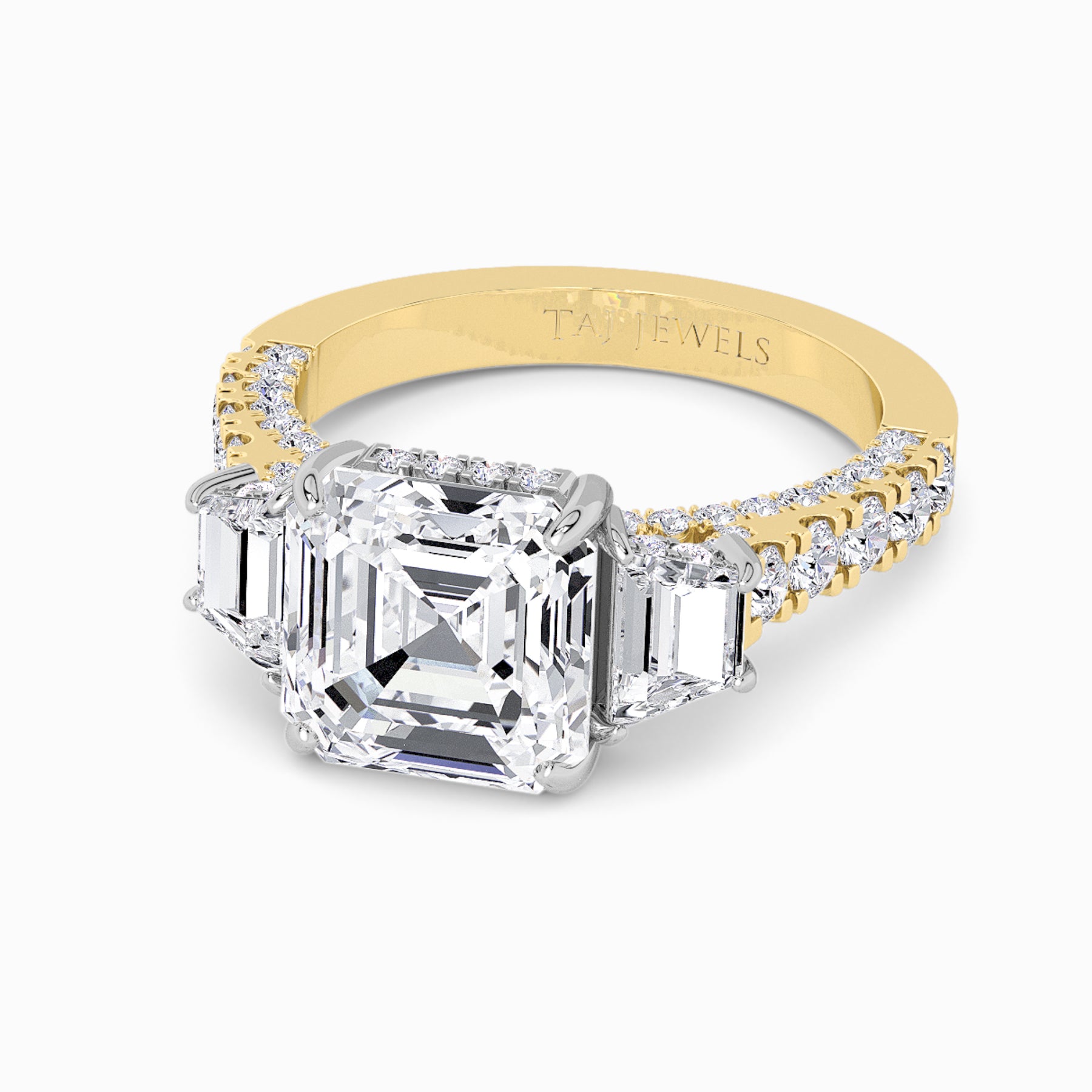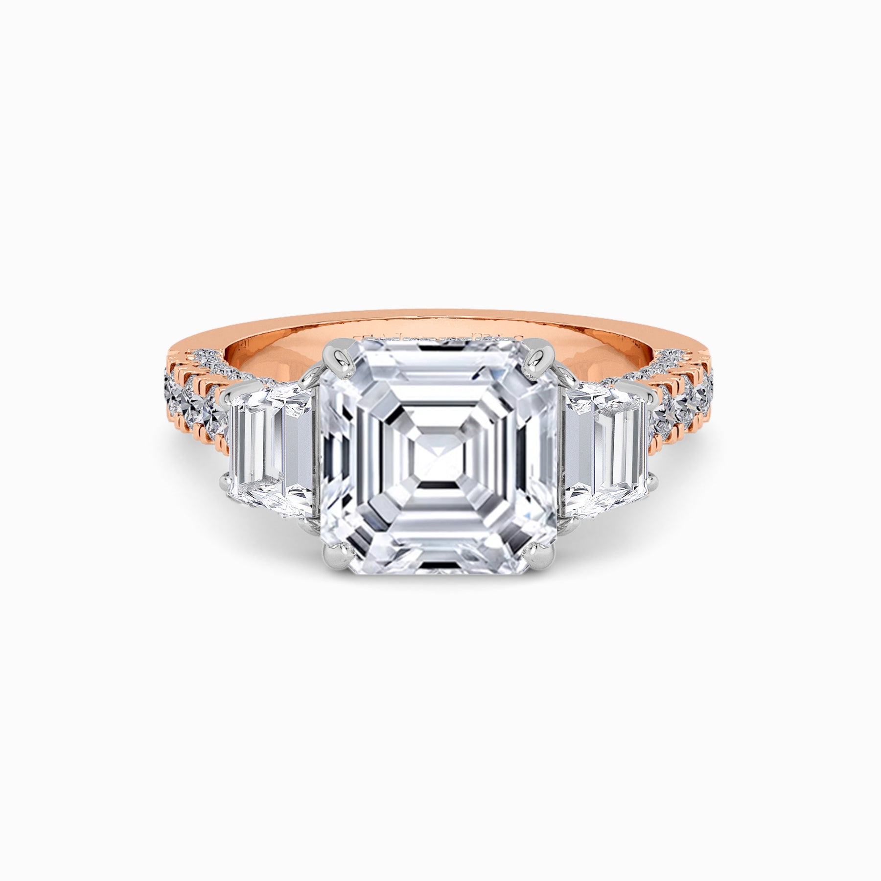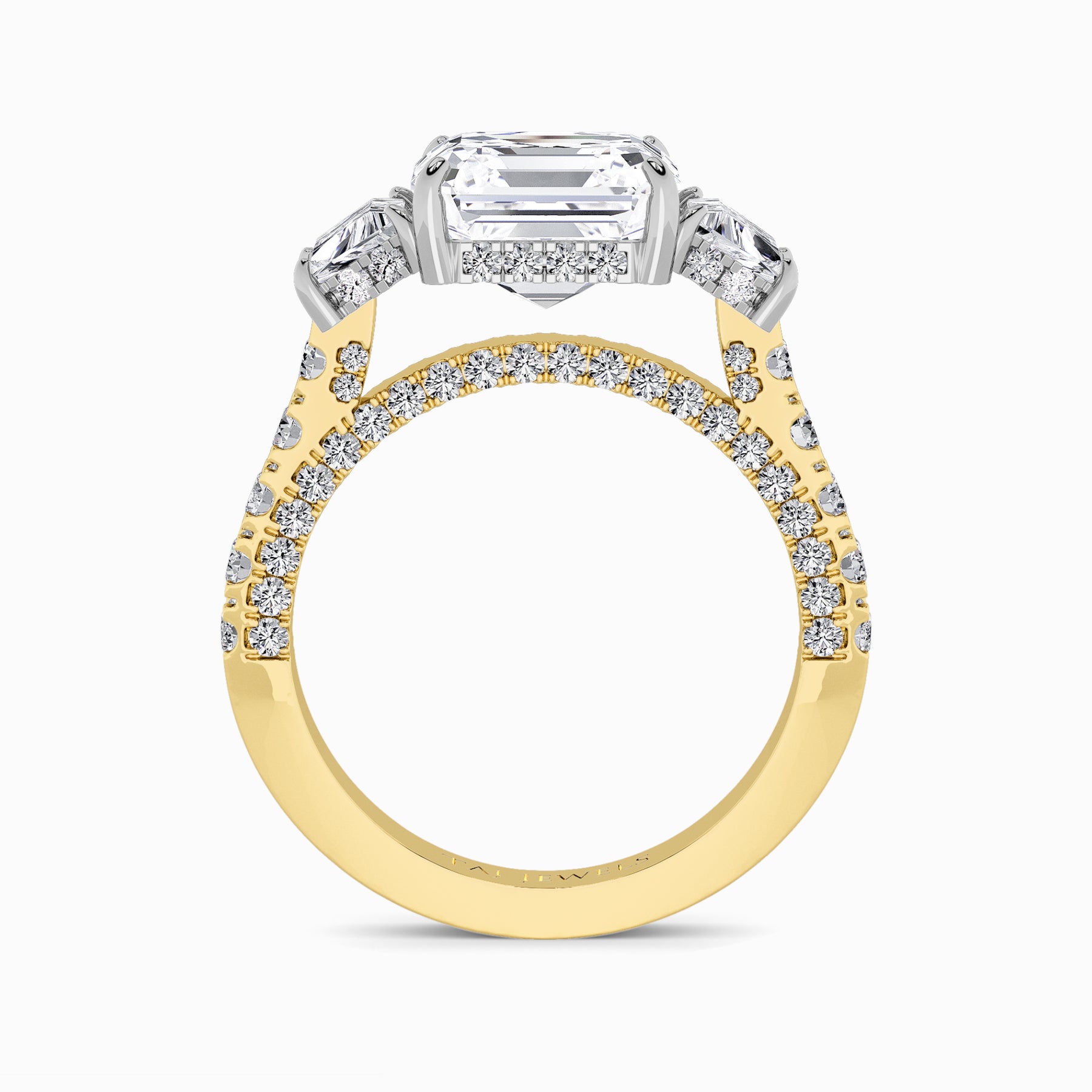 A striking expression of timeless sophistication, this 1.50ct+ Asscher cut lab diamond engagement ring is designed to captivate from every angle. The centre stone is elegantly framed by two trapezoid-cut side diamonds, while the elevated setting showcases a beautiful open gallery adorned with 3D pave band. Beneath the centre stone, a discreet diamond-set halo enhances depth, brilliance, and architectural interest without detracting from the centre diamond’s overall presence.