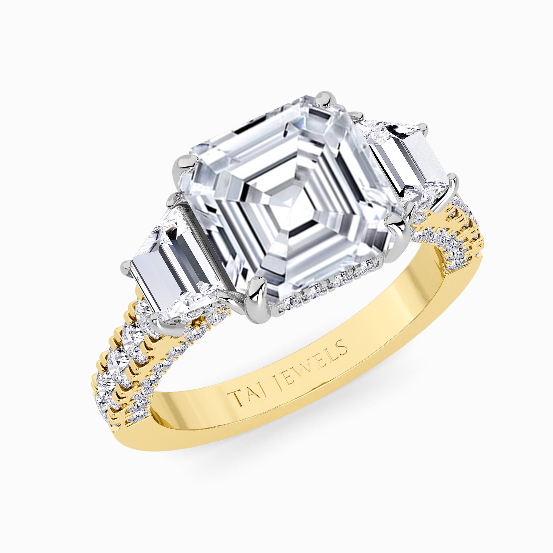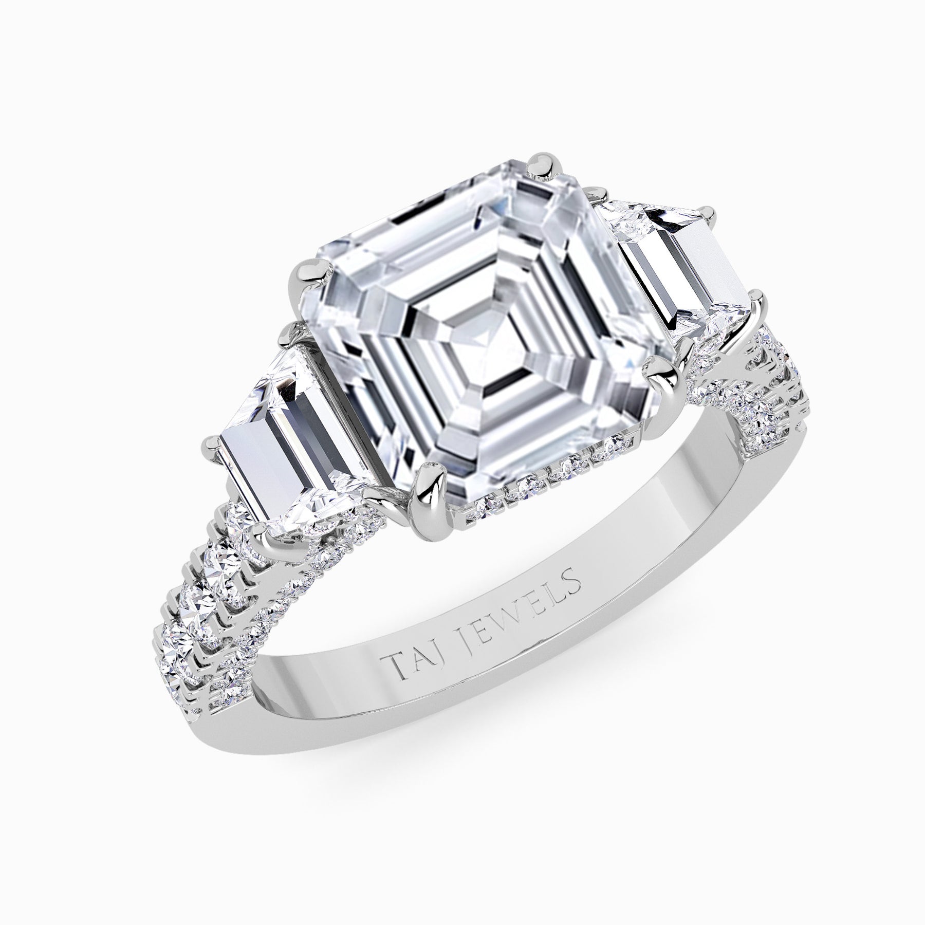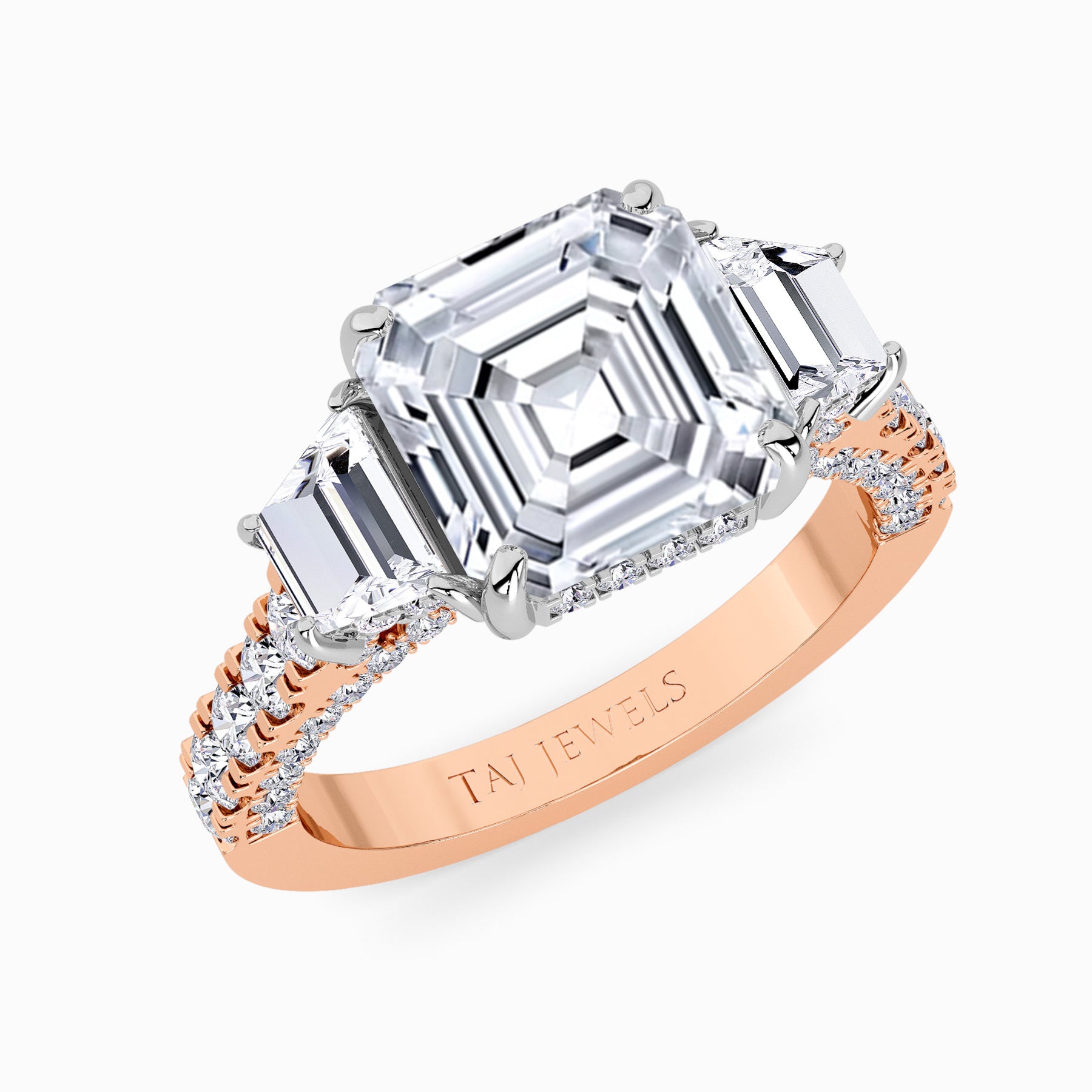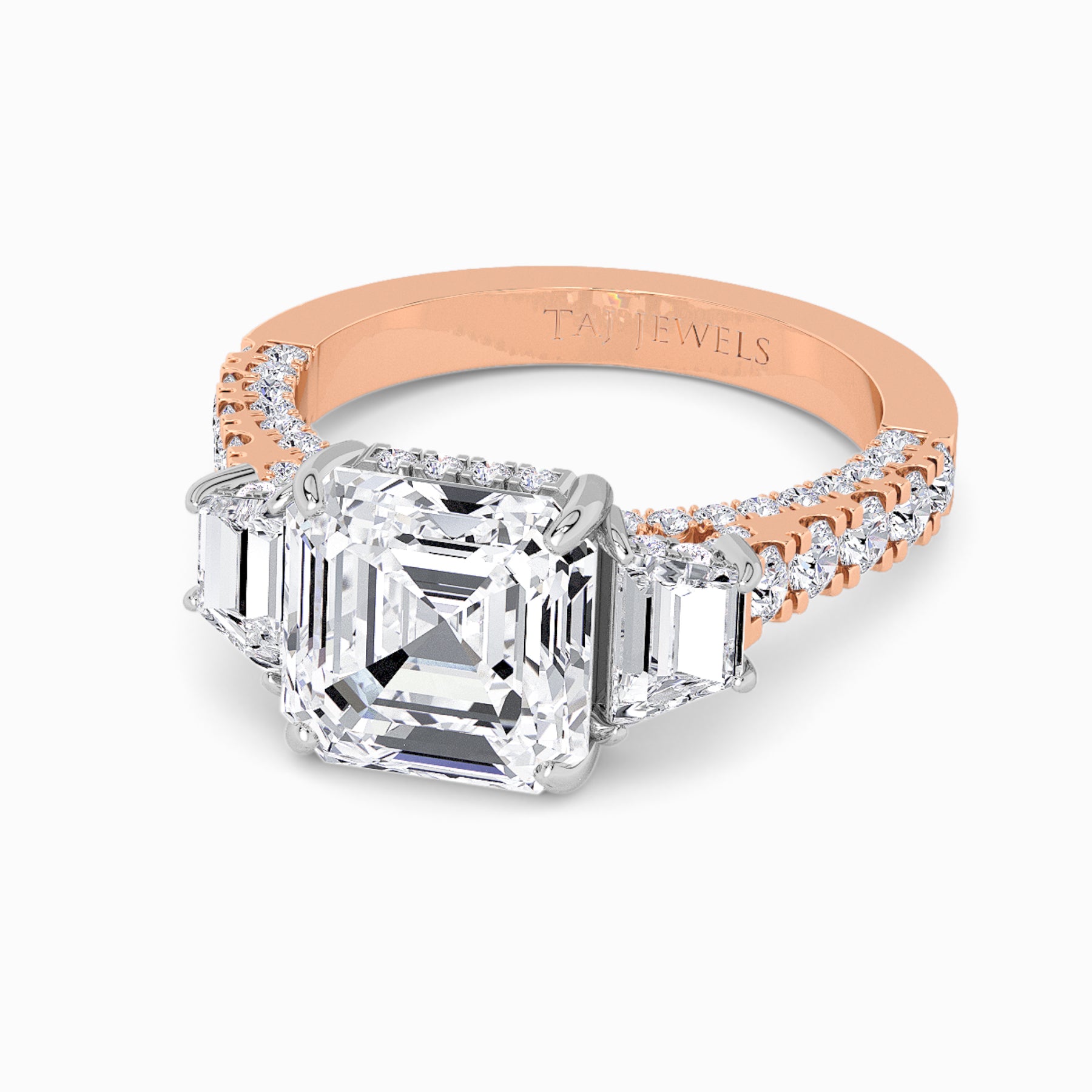 A striking expression of timeless sophistication, this 1.50ct+ Asscher cut lab diamond engagement ring is designed to captivate from every angle. The centre stone is elegantly framed by two trapezoid-cut side diamonds, while the elevated setting showcases a beautiful open gallery adorned with 3D pave band. Beneath the centre stone, a discreet diamond-set halo enhances depth, brilliance, and architectural interest without detracting from the centre diamond’s overall presence.
