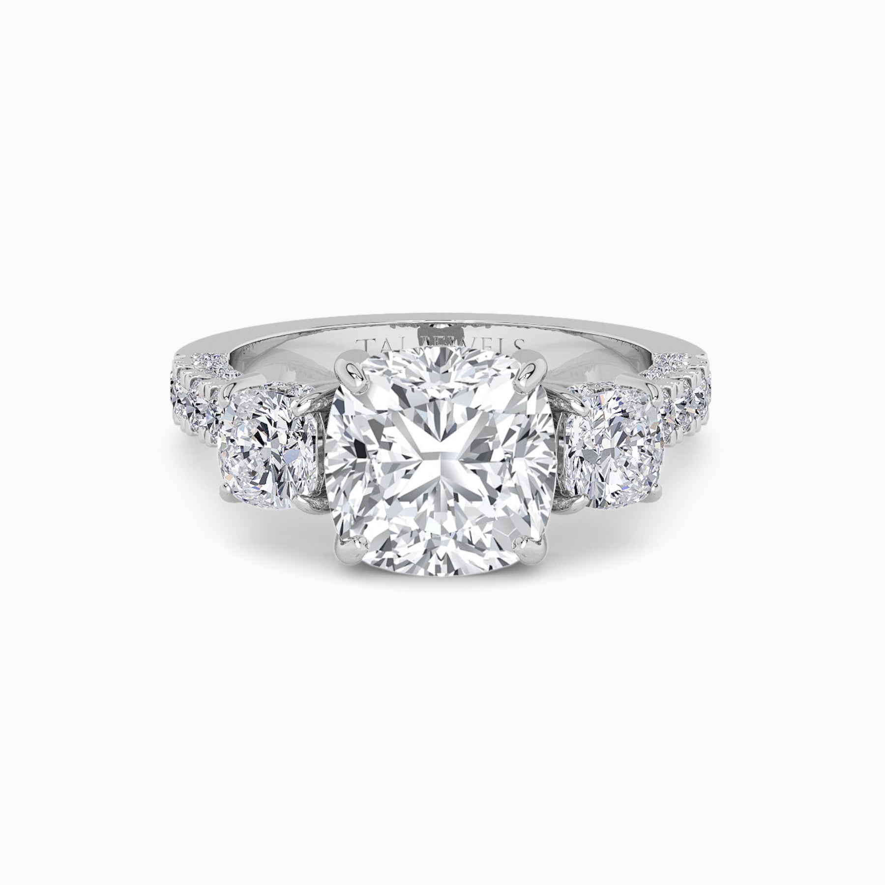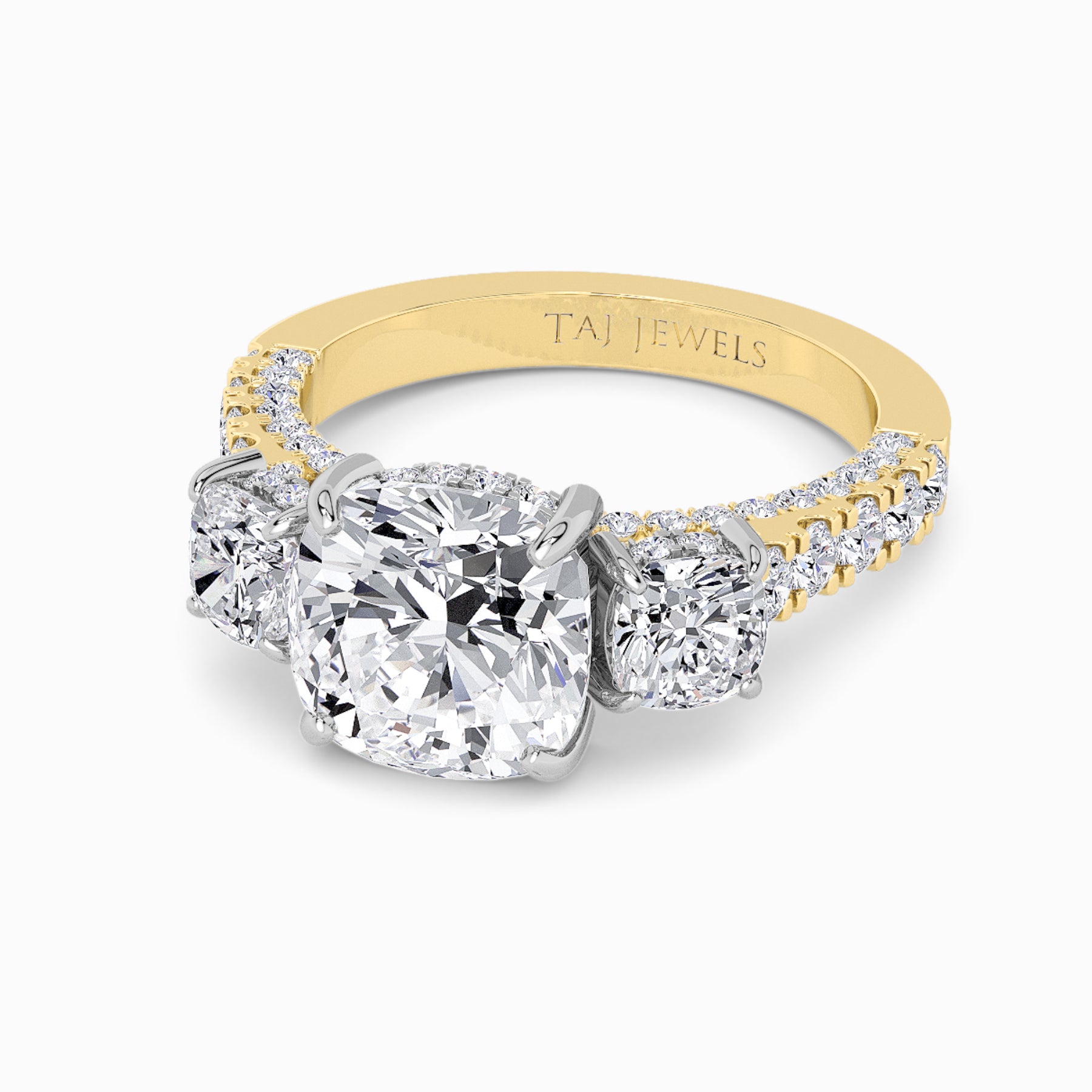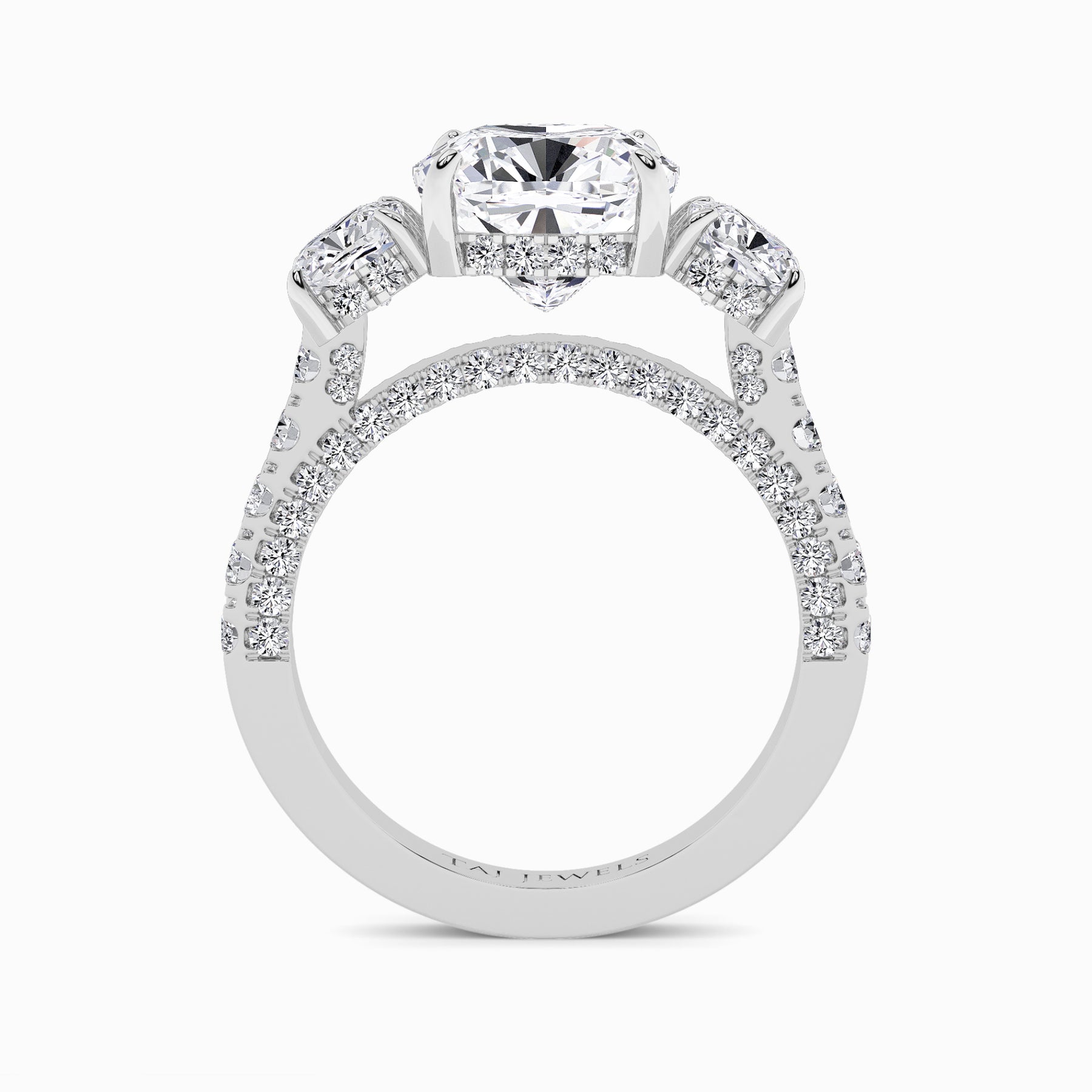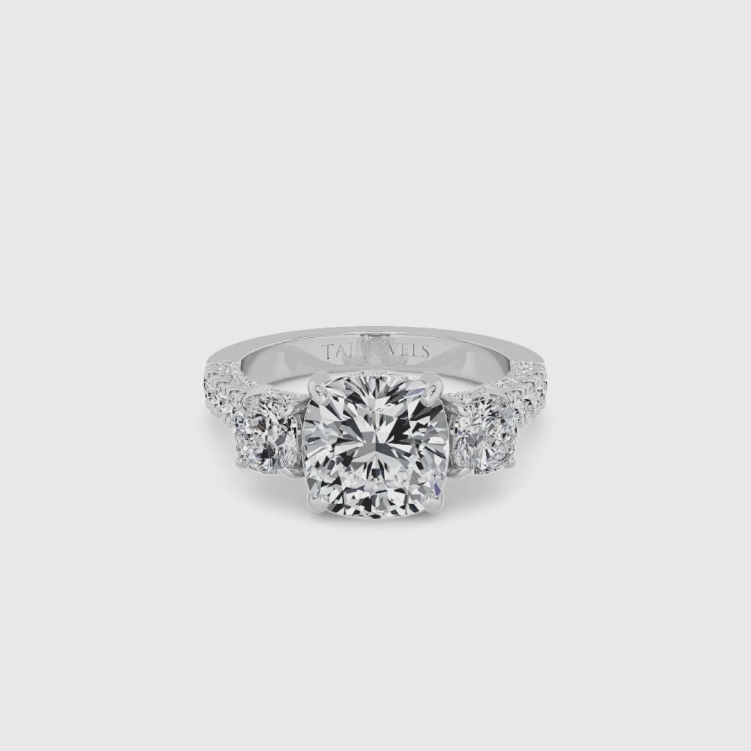 A striking expression of timeless sophistication, this 1.50ct+ Cushion cut lab diamond engagement ring is designed to captivate from every angle. The centre stone is elegantly framed by two Cushion-cut side diamonds, while the elevated setting showcases a beautiful open gallery adorned with 3D pave band. Beneath the centre stone, a discreet diamond-set halo enhances depth, brilliance, and architectural interest without detracting from the centre diamond’s overall presence.