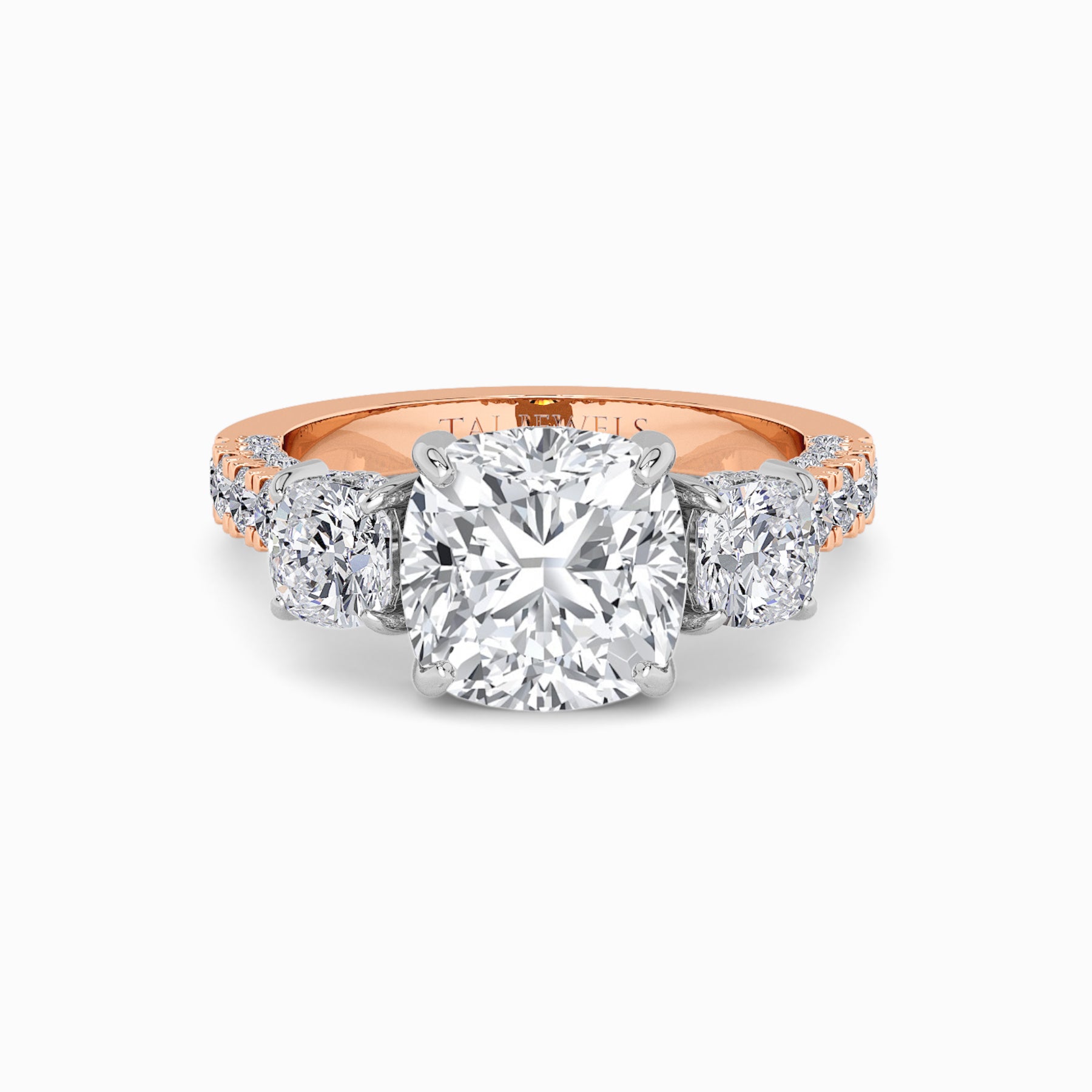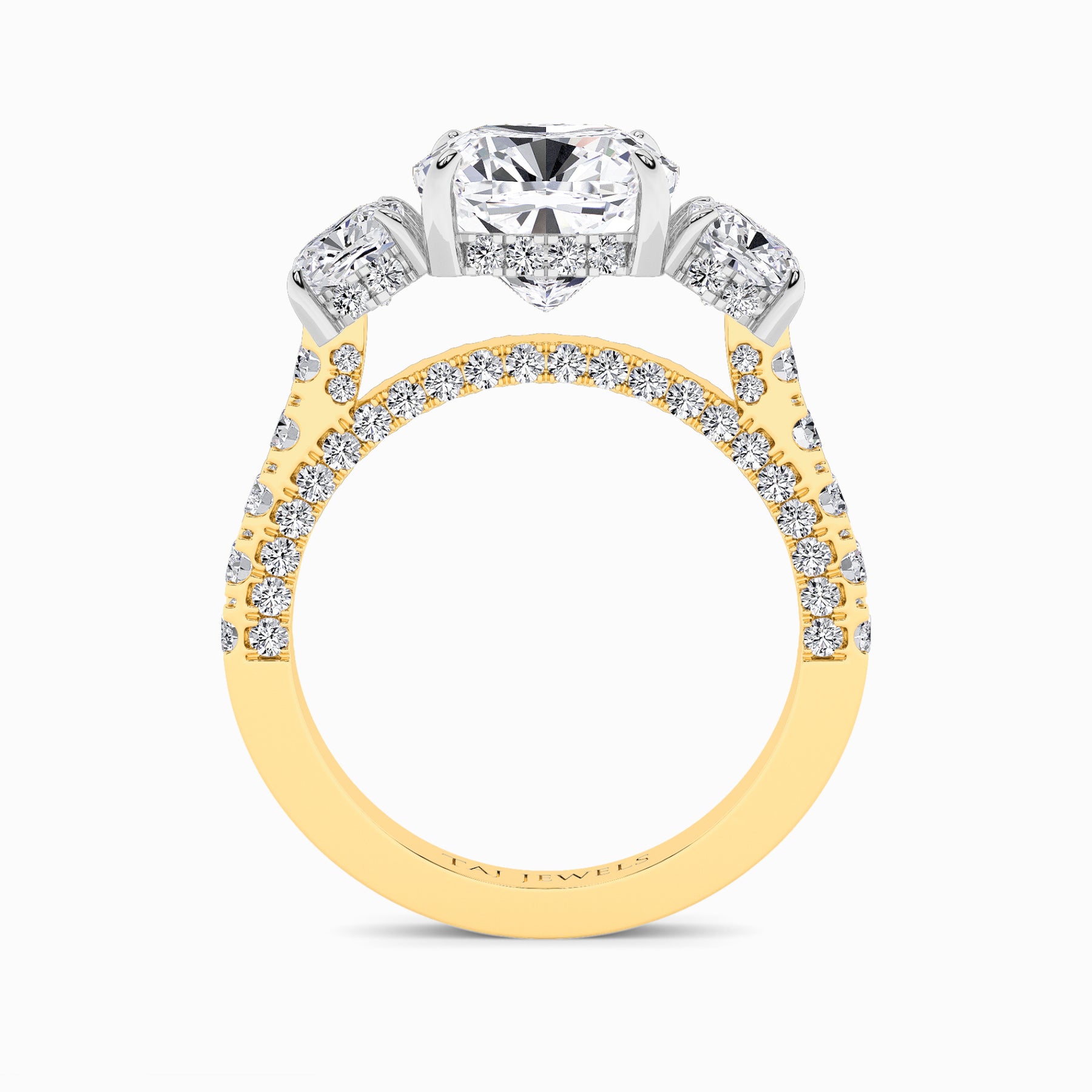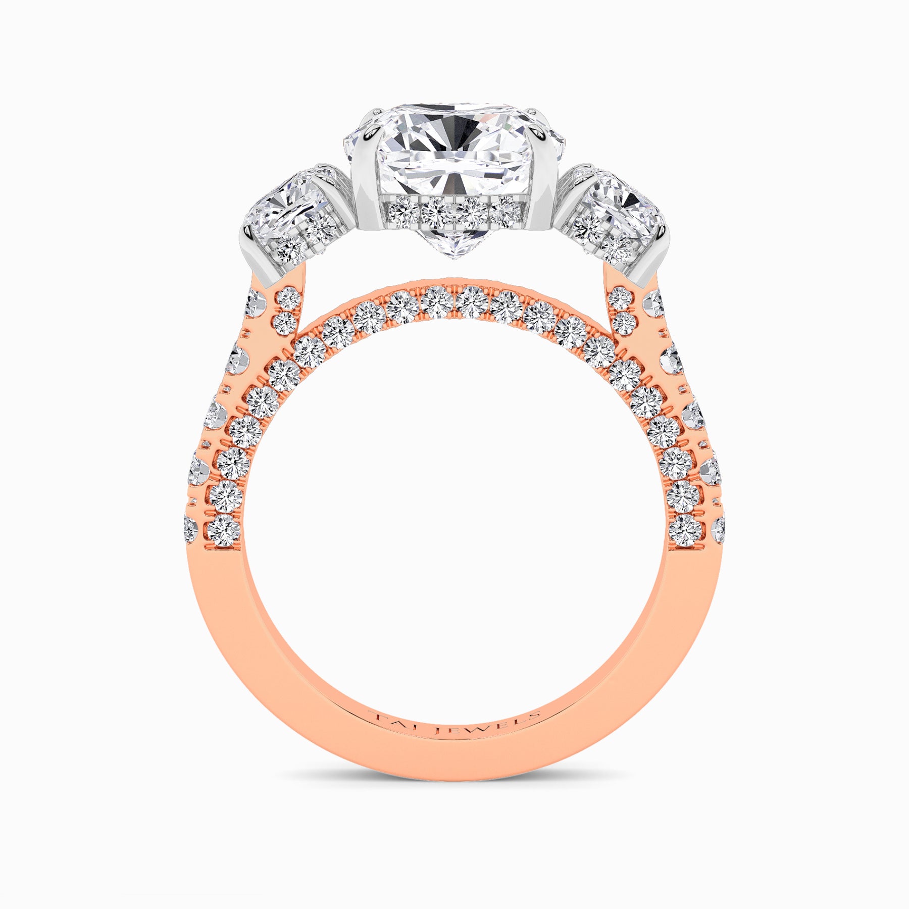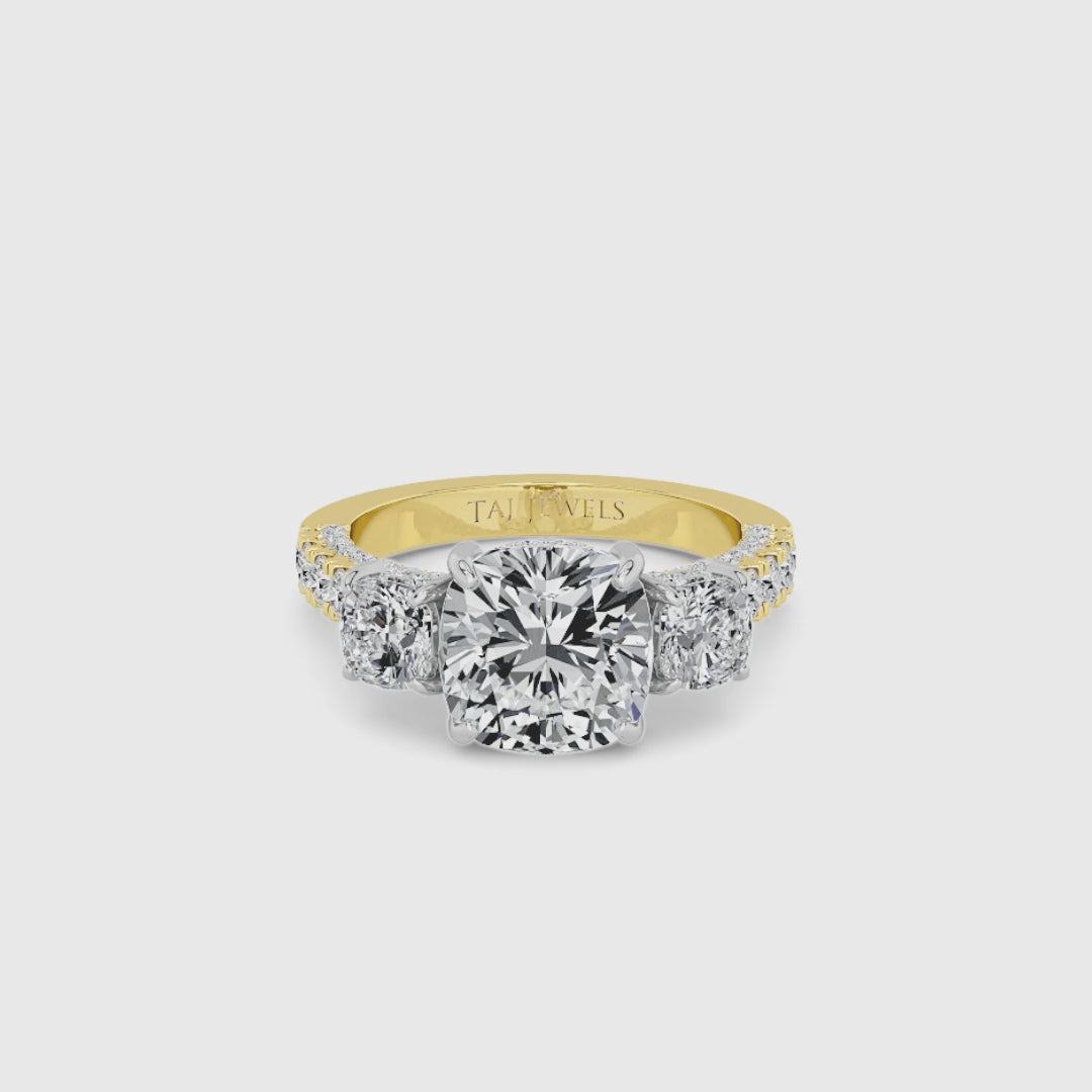 A striking expression of timeless sophistication, this 1.50ct+ Cushion cut lab diamond engagement ring is designed to captivate from every angle. The centre stone is elegantly framed by two Cushion-cut side diamonds, while the elevated setting showcases a beautiful open gallery adorned with 3D pave band. Beneath the centre stone, a discreet diamond-set halo enhances depth, brilliance, and architectural interest without detracting from the centre diamond’s overall presence.