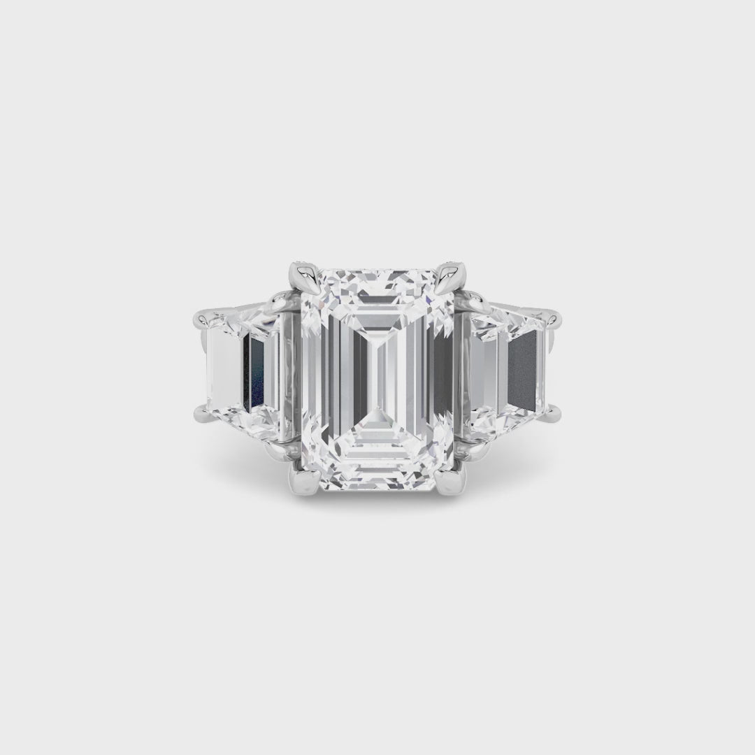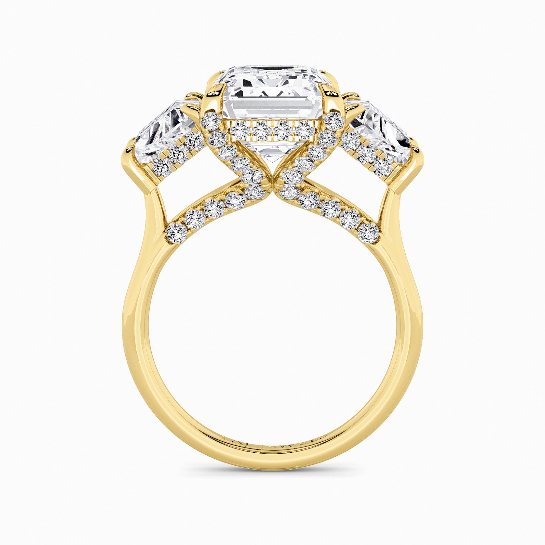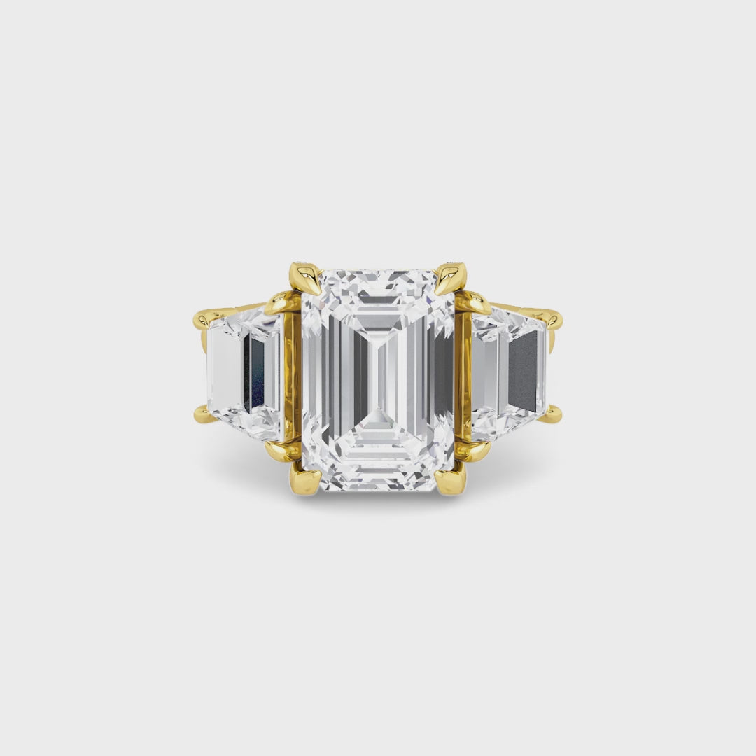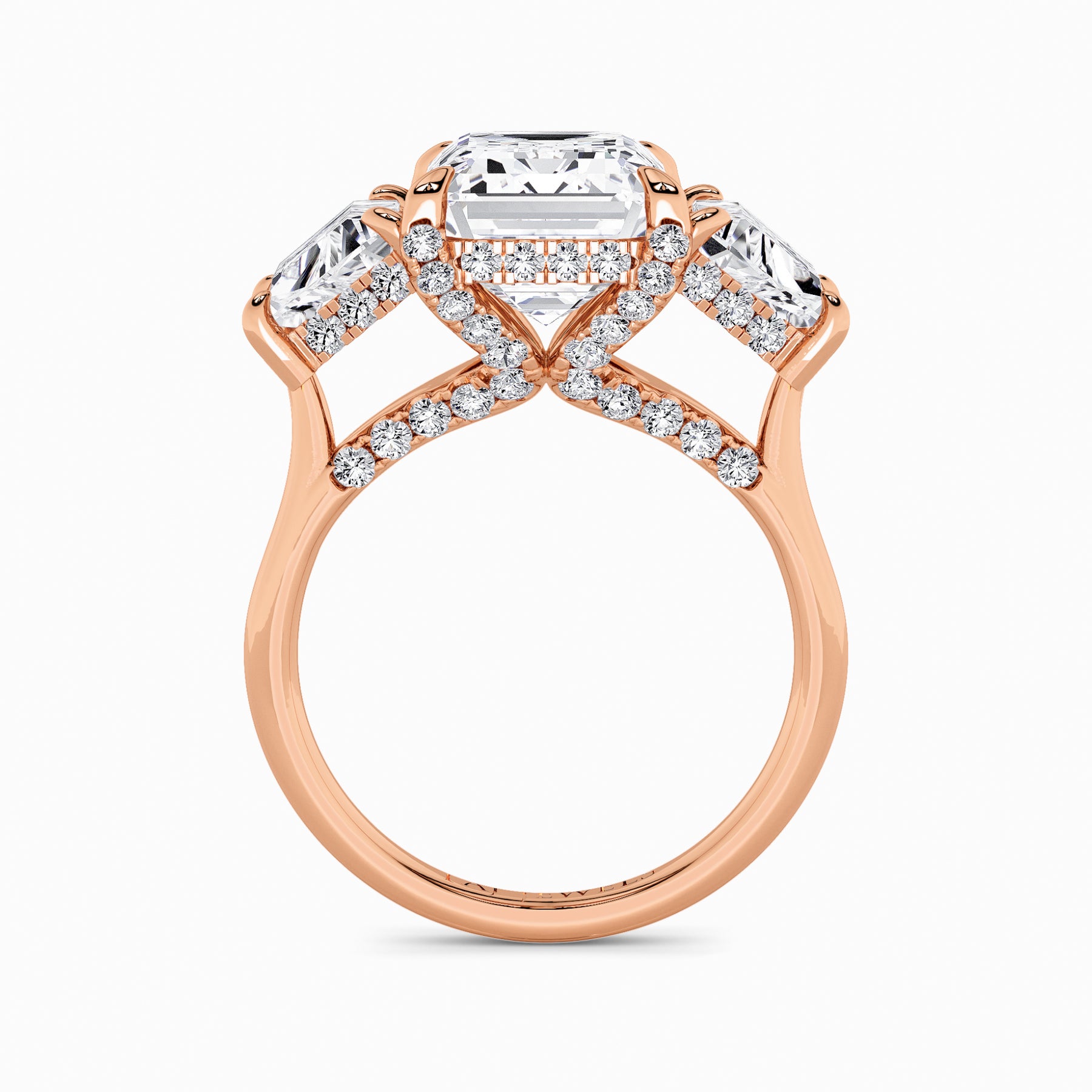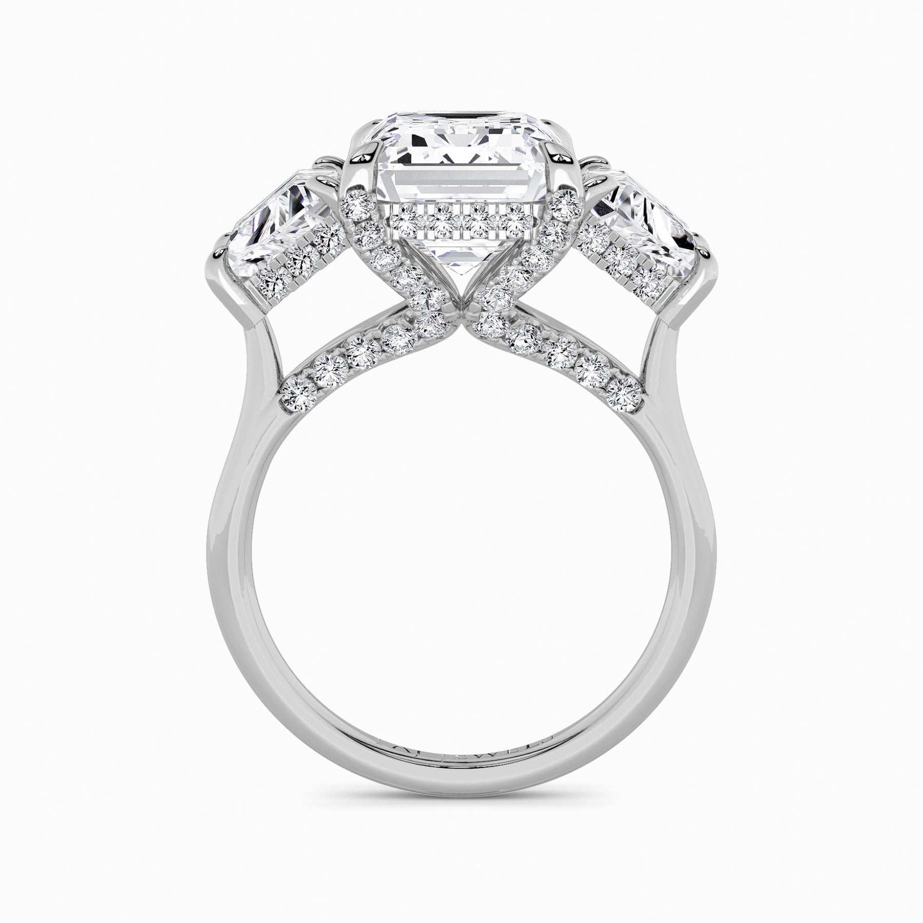 A striking expression of timeless sophistication, this 1.50ct+ Emerald cut lab diamond engagement ring is designed to captivate from every angle. The centre stone is elegantly framed by two trapezoid side diamonds, while the elevated setting showcases a beautifully detailed crossover gallery adorned with micro-pavé diamonds. Beneath the centre stone, a discreet diamond-set halo enhances depth, brilliance, and architectural interest without detracting from the centre diamond’s overall presence.
