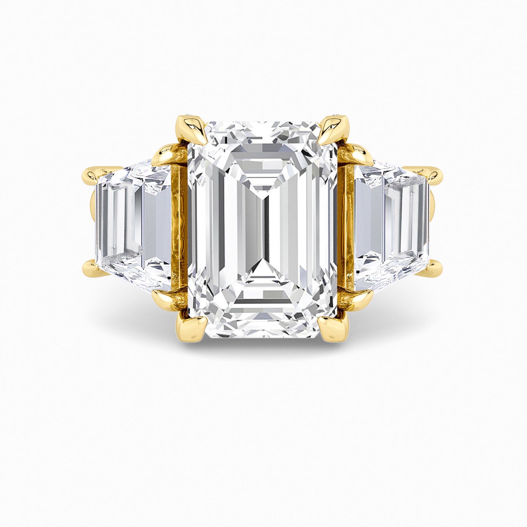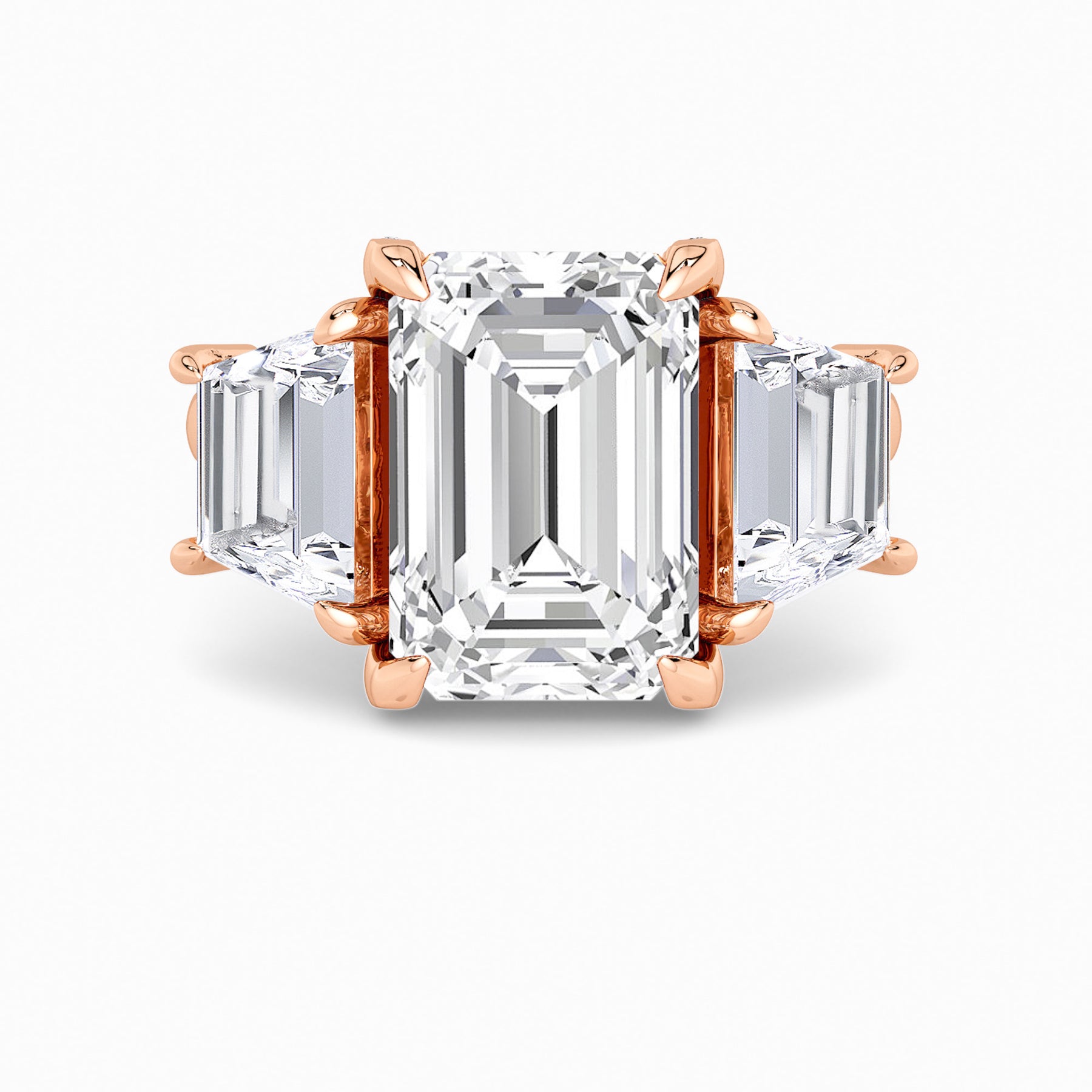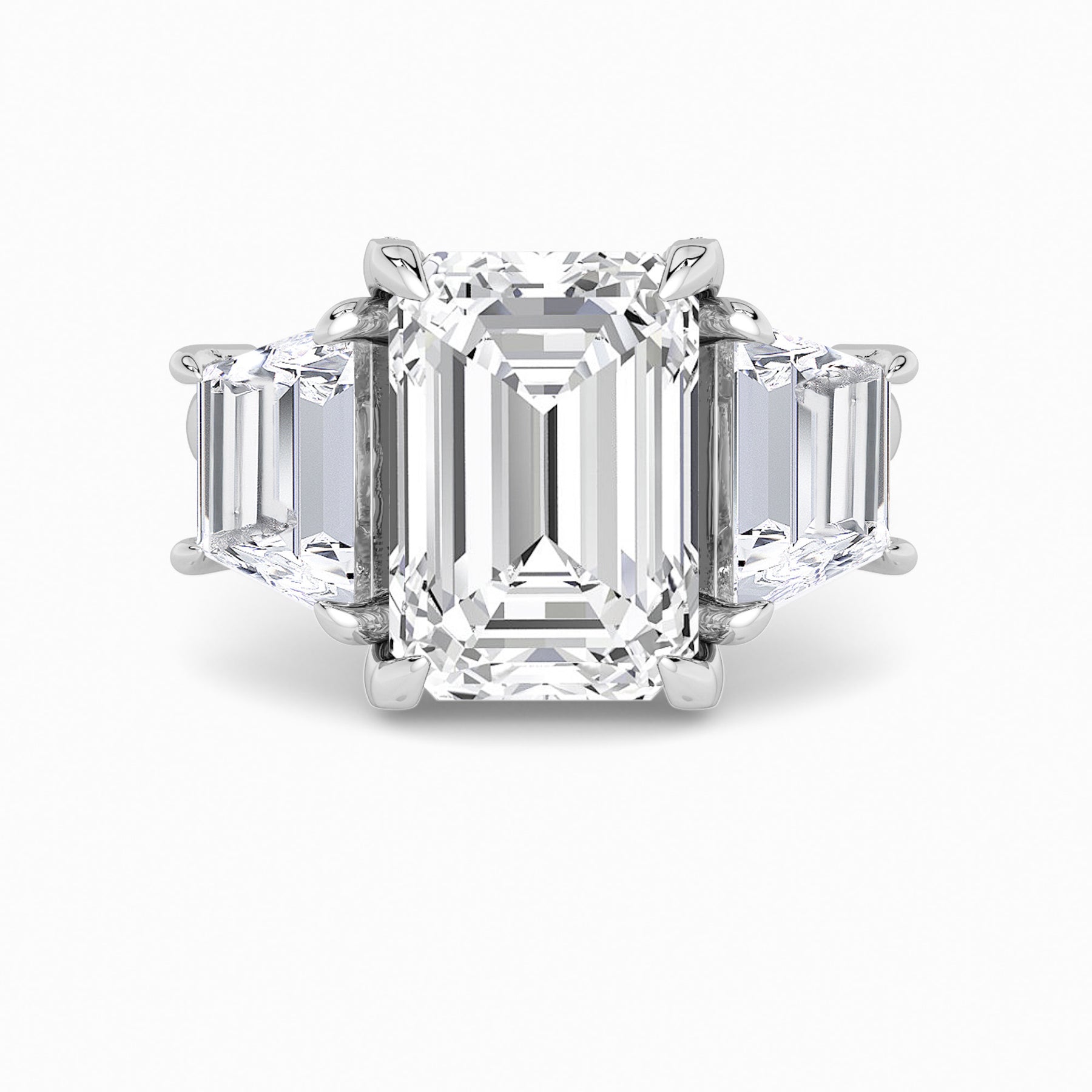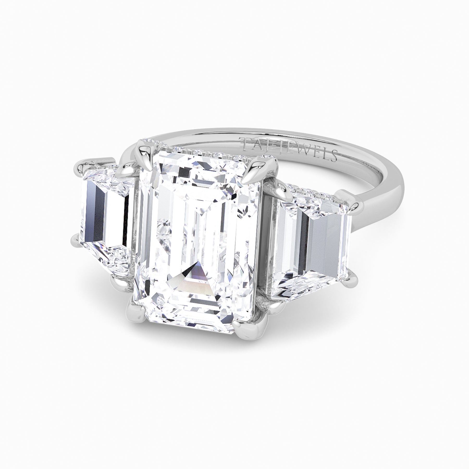 A striking expression of timeless sophistication, this 1.50ct+ Emerald cut lab diamond engagement ring is designed to captivate from every angle. The centre stone is elegantly framed by two trapezoid side diamonds, while the elevated setting showcases a beautifully detailed crossover gallery adorned with micro-pavé diamonds. Beneath the centre stone, a discreet diamond-set halo enhances depth, brilliance, and architectural interest without detracting from the centre diamond’s overall presence.
