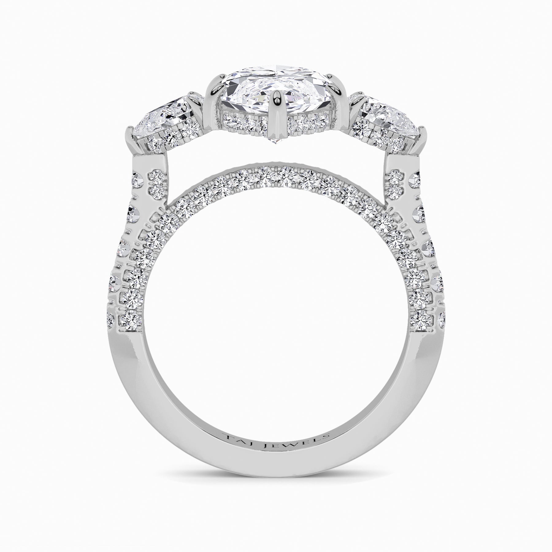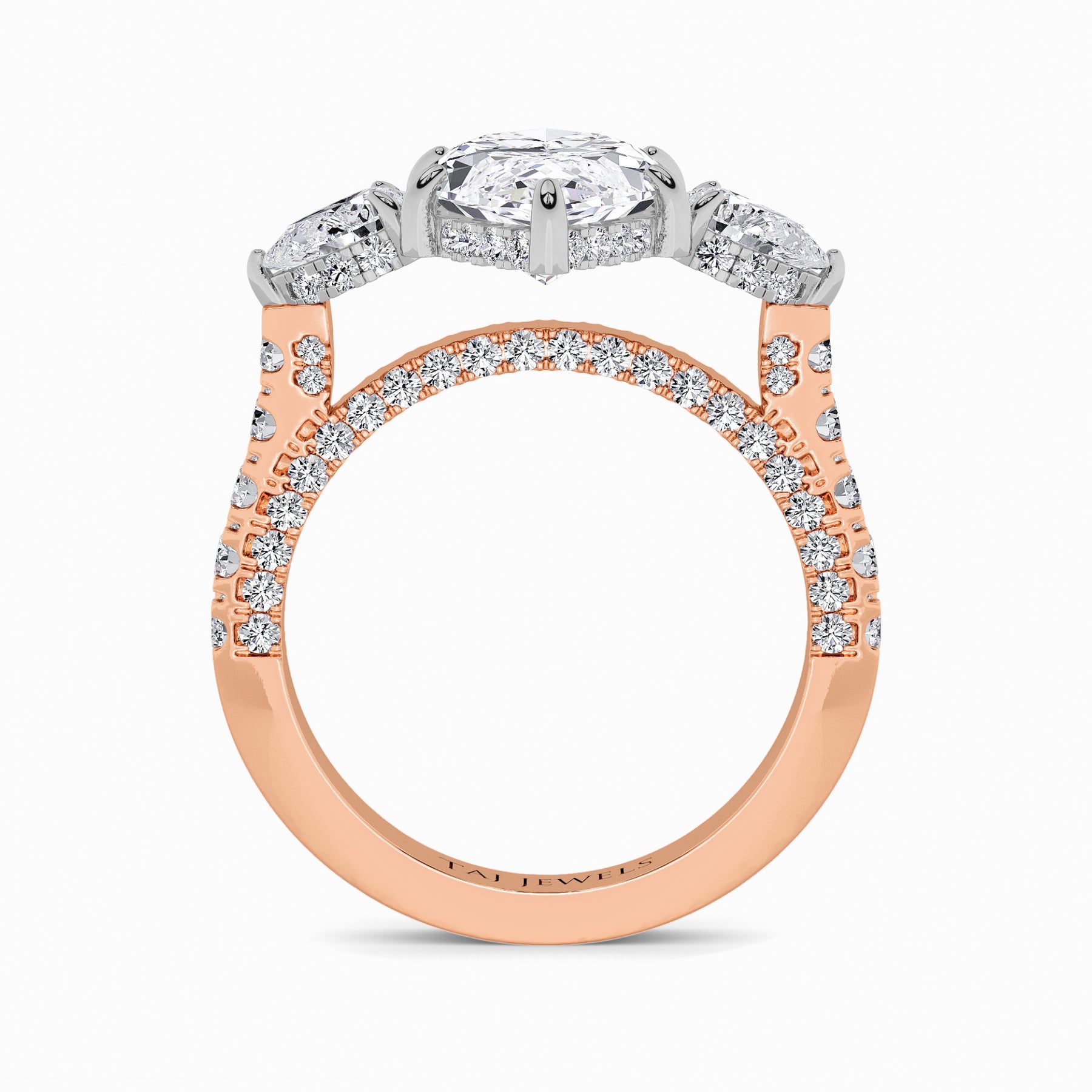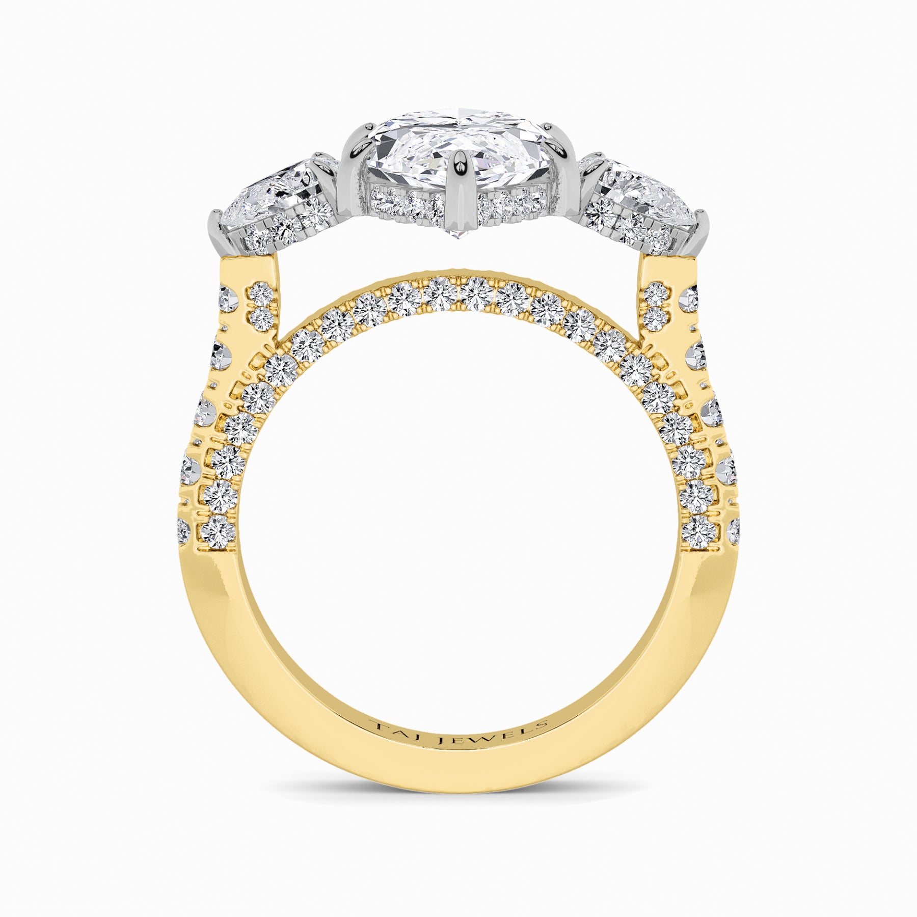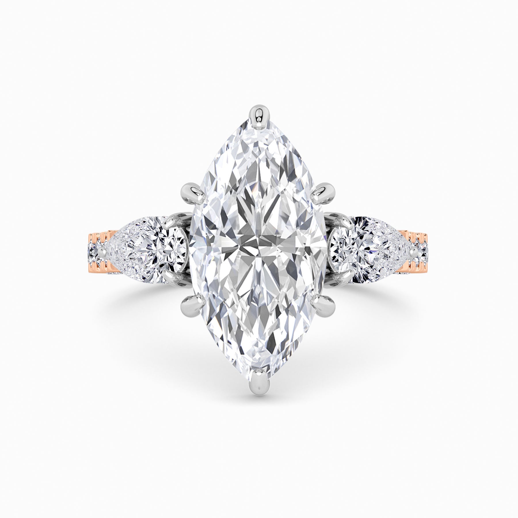 A striking expression of timeless sophistication, this 1.50ct+ Marquise cut lab diamond engagement ring is designed to captivate from every angle. The centre stone is elegantly framed by two pear-cut side diamonds, while the elevated setting showcases a beautiful open gallery adorned with 3D pave band. Beneath the centre stone, a discreet diamond-set halo enhances depth, brilliance, and architectural interest without detracting from the centre diamond’s overall presence.