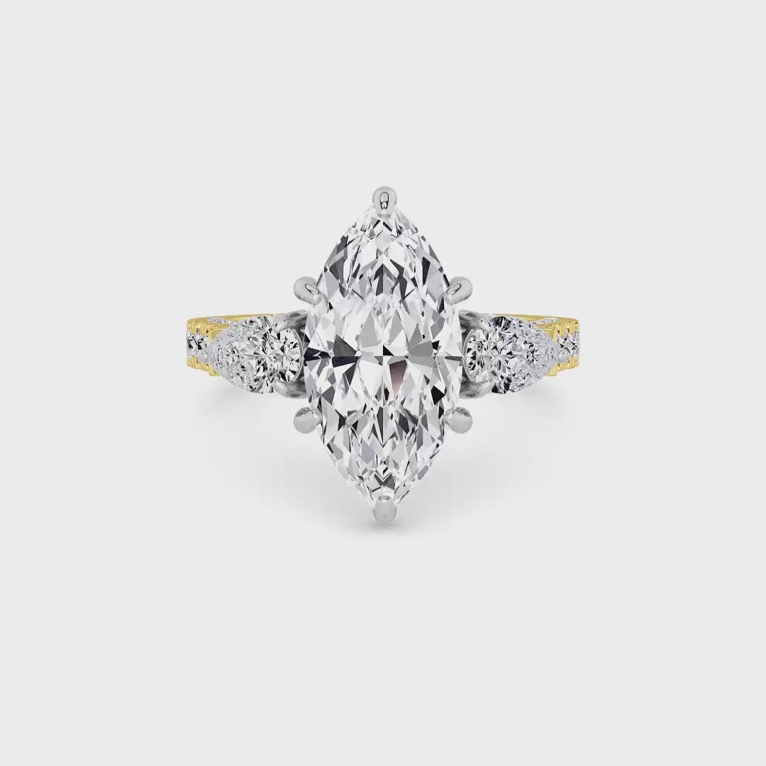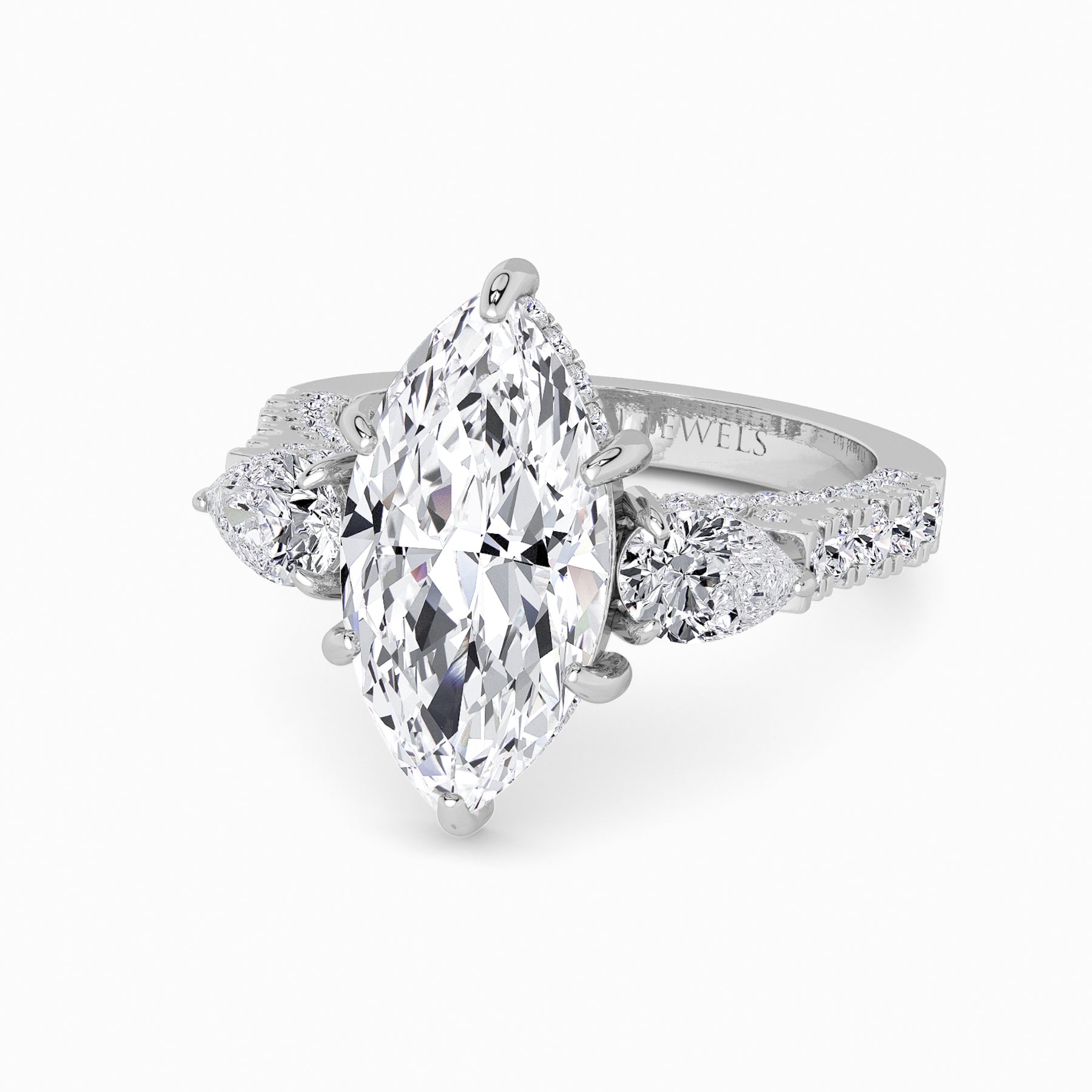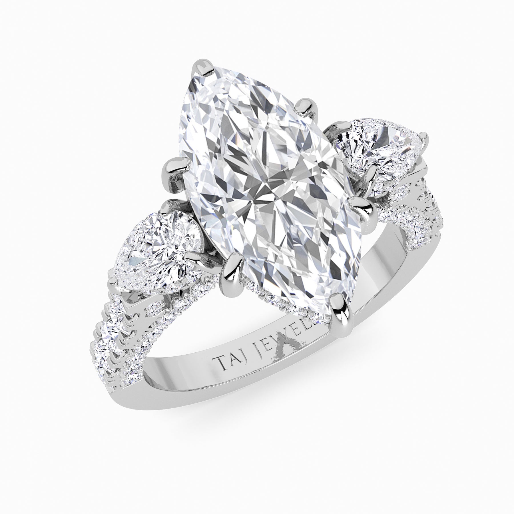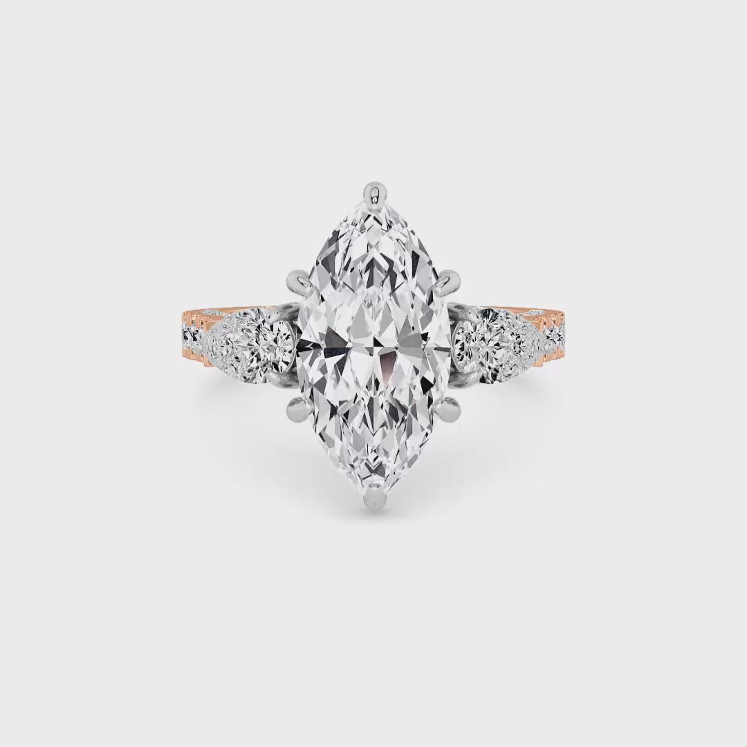 A striking expression of timeless sophistication, this 1.50ct+ Marquise cut lab diamond engagement ring is designed to captivate from every angle. The centre stone is elegantly framed by two pear-cut side diamonds, while the elevated setting showcases a beautiful open gallery adorned with 3D pave band. Beneath the centre stone, a discreet diamond-set halo enhances depth, brilliance, and architectural interest without detracting from the centre diamond’s overall presence.