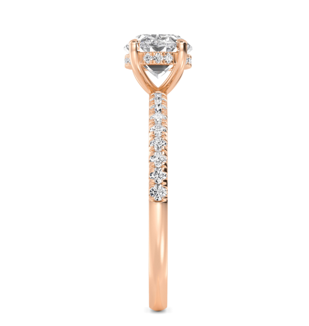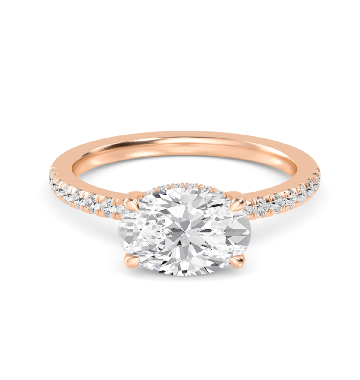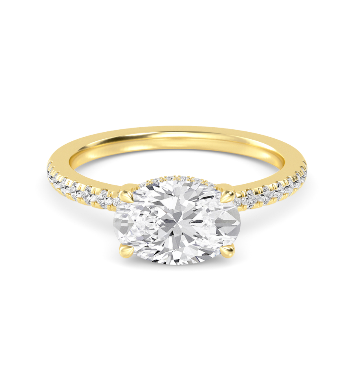 Presenting our gorgeous 1.00ct+ IGI Certified Centre Lab-Grown Oval Cut Lab Diamond East West Engagement Ring set on a stunning Floating Head Setting with diamond shoulder and adorned with a hidden halo.