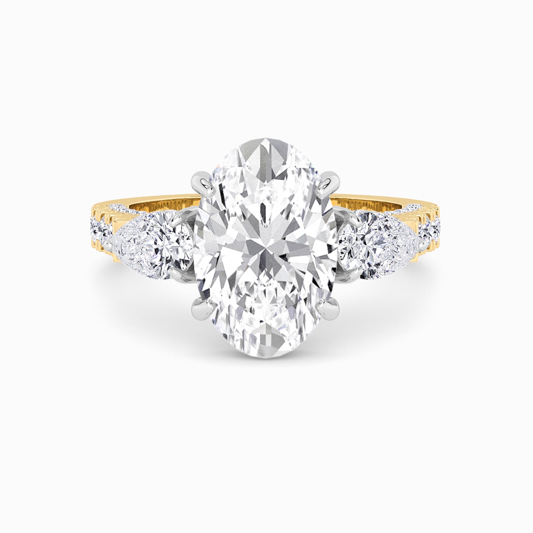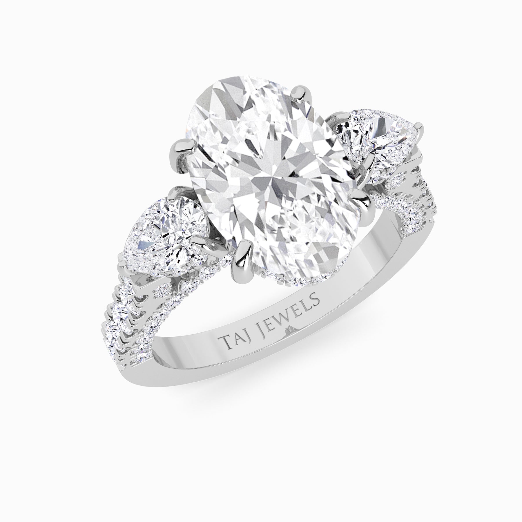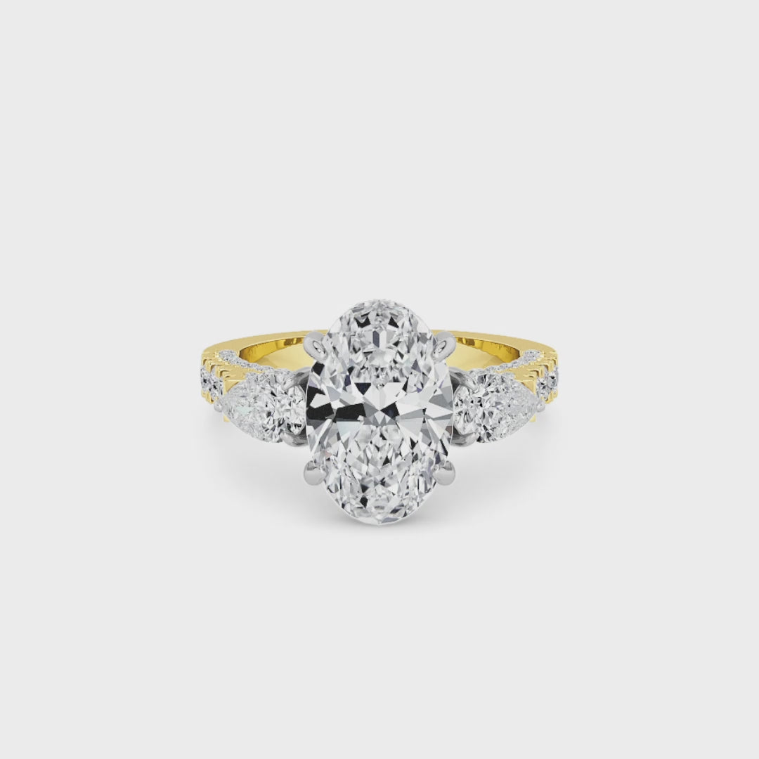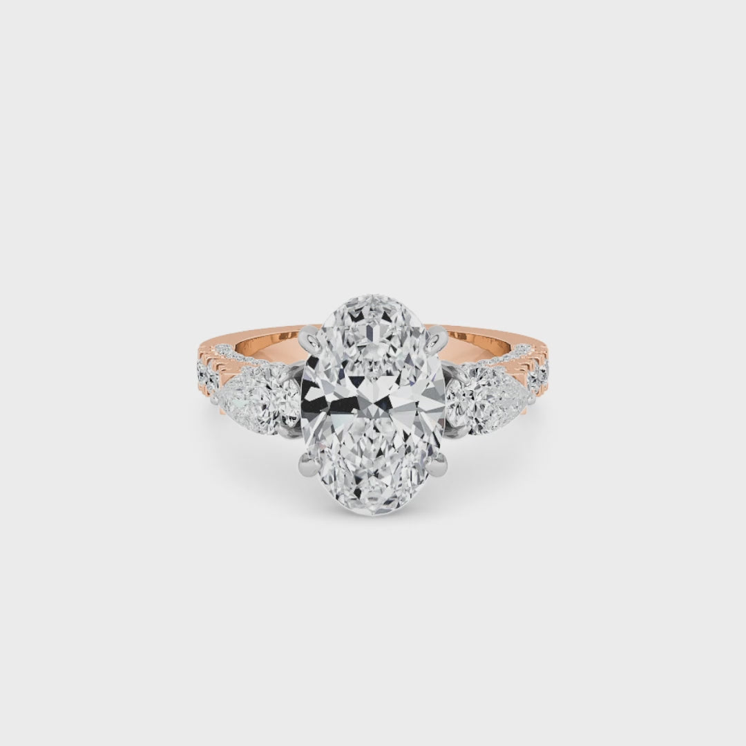 A striking expression of timeless sophistication, this 1.50ct+ Oval cut lab diamond engagement ring is designed to captivate from every angle. The centre stone is elegantly framed by two pear-cut side diamonds, while the elevated setting showcases a beautiful open gallery adorned with 3D pave band. Beneath the centre stone, a discreet diamond-set halo enhances depth, brilliance, and architectural interest without detracting from the centre diamond’s overall presence.