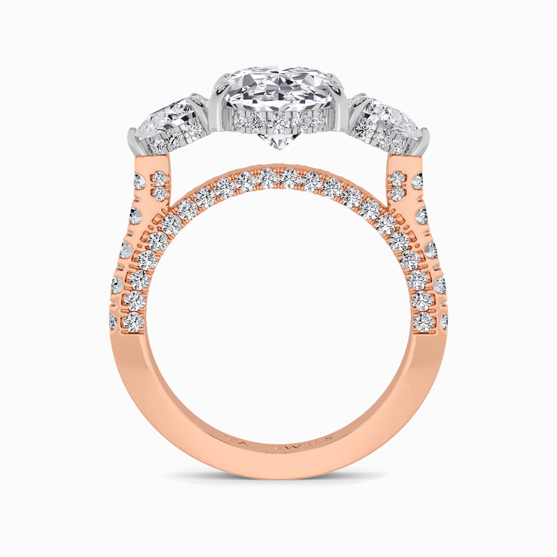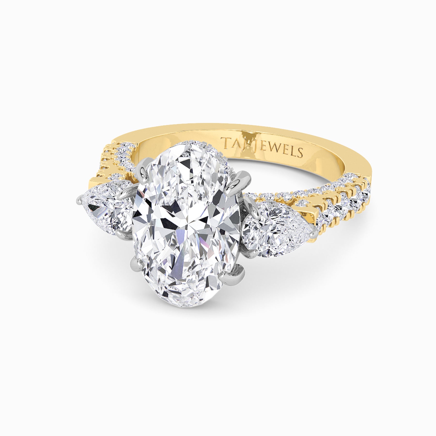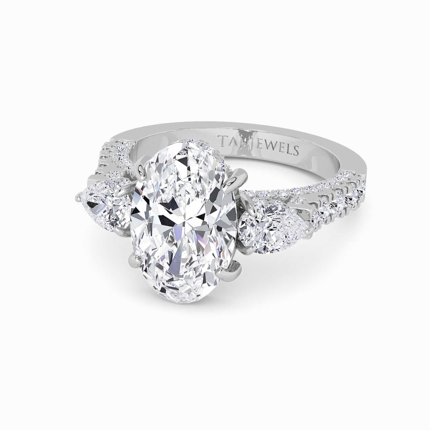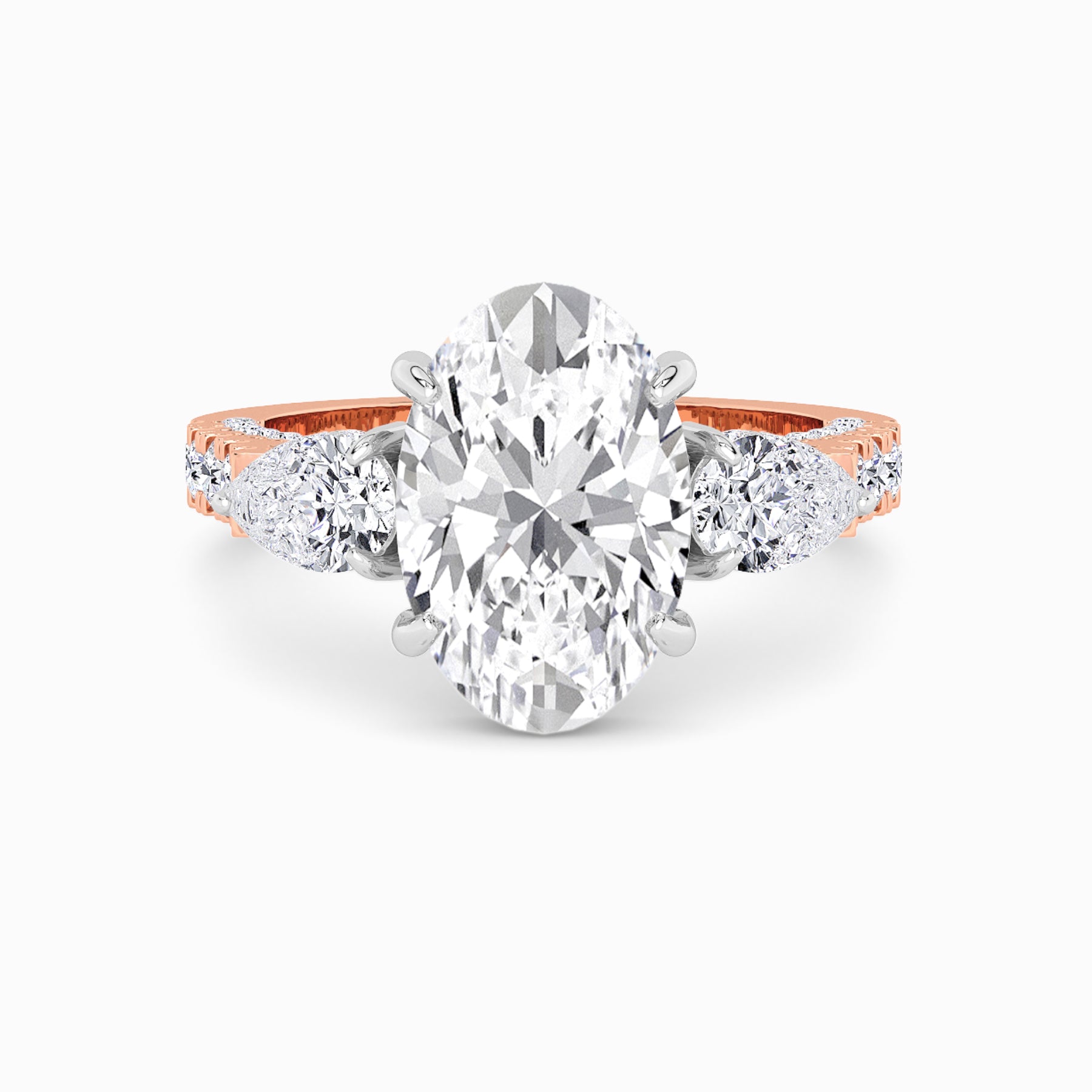 A striking expression of timeless sophistication, this 1.50ct+ Oval cut lab diamond engagement ring is designed to captivate from every angle. The centre stone is elegantly framed by two pear-cut side diamonds, while the elevated setting showcases a beautiful open gallery adorned with 3D pave band. Beneath the centre stone, a discreet diamond-set halo enhances depth, brilliance, and architectural interest without detracting from the centre diamond’s overall presence.