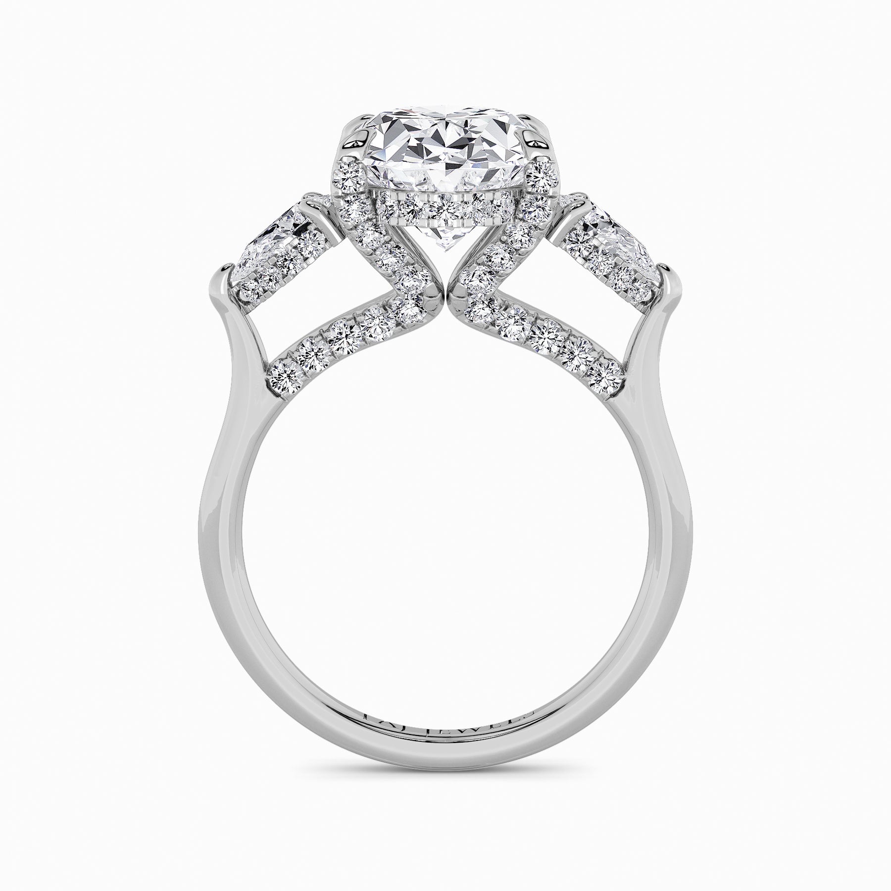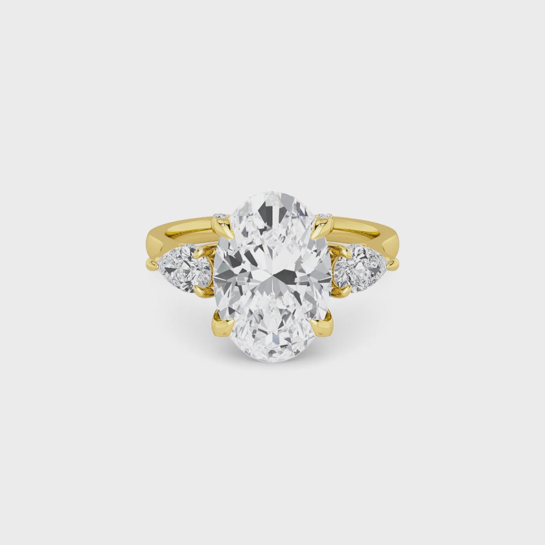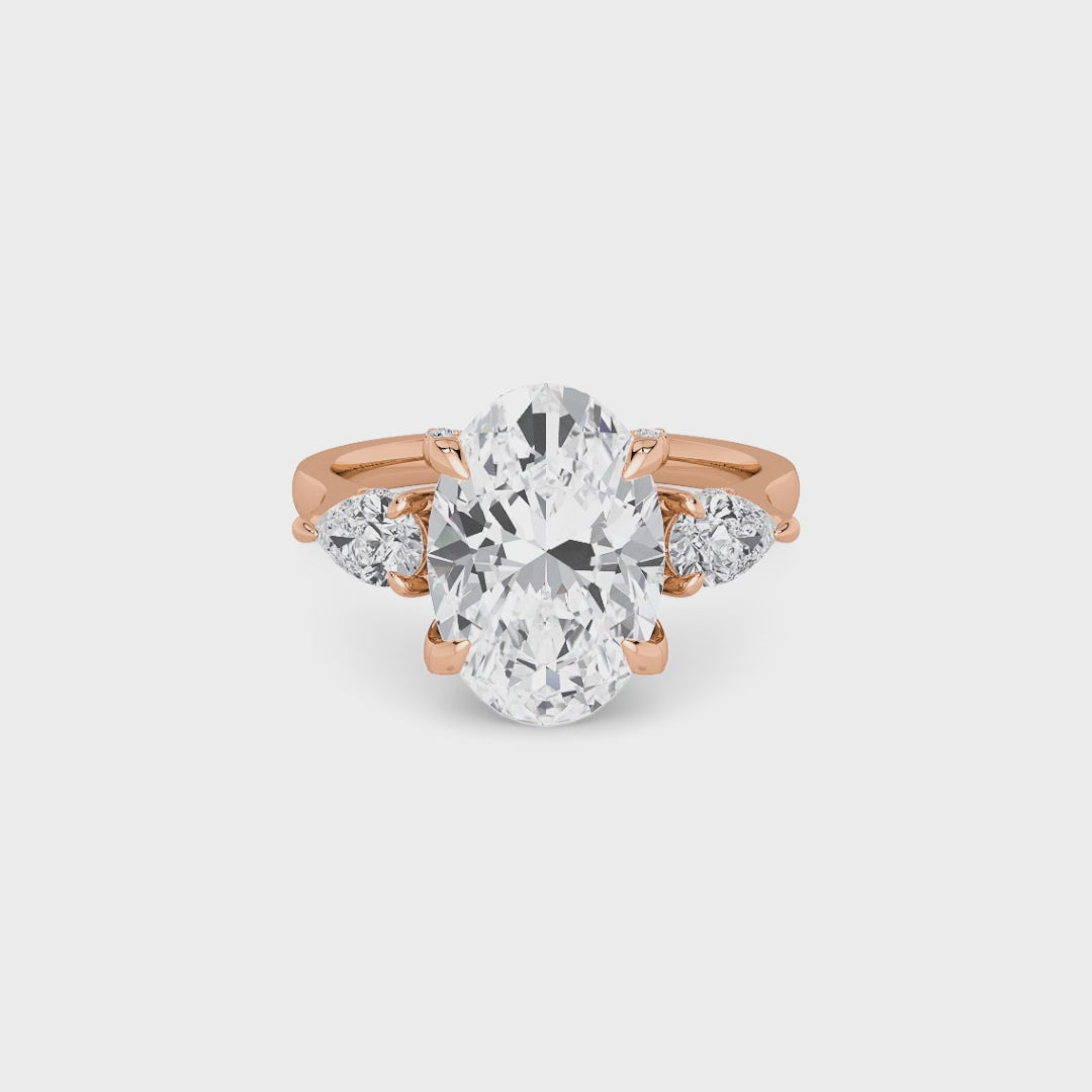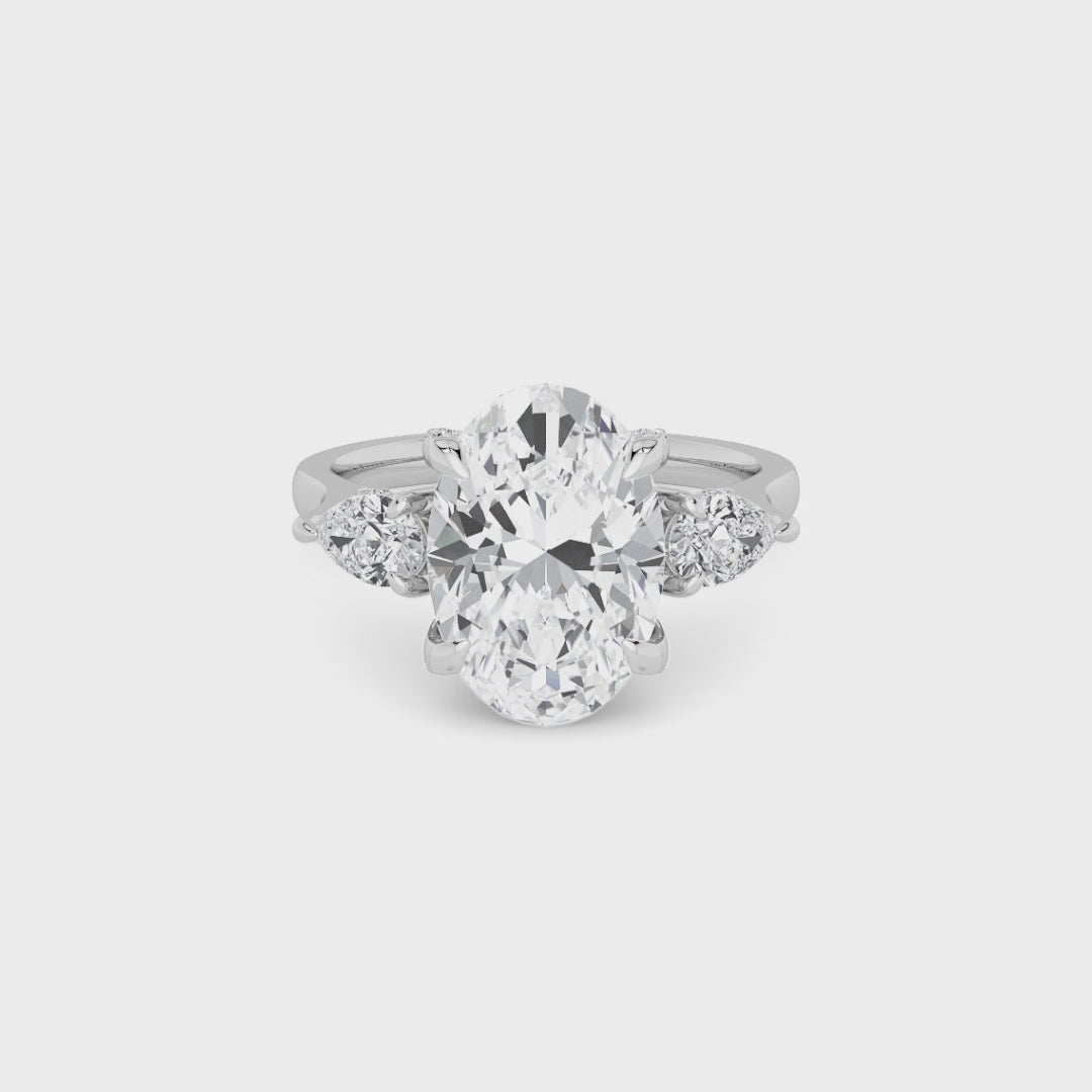 A striking expression of timeless sophistication, this 1.50ct+ Oval Brilliant lab diamond engagement ring is designed to captivate from every angle. The centre stone is elegantly framed by two pear side diamonds, while the elevated setting showcases a beautifully detailed crossover gallery adorned with micro-pavé diamonds. Beneath the centre stone, a discreet diamond-set halo enhances depth, brilliance, and architectural interest without detracting from the centre diamond’s overall presence.
