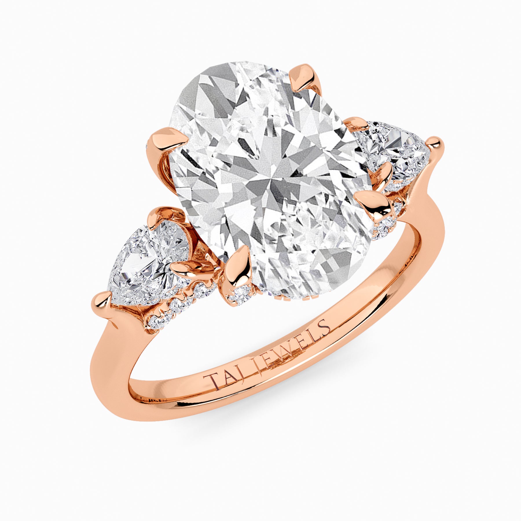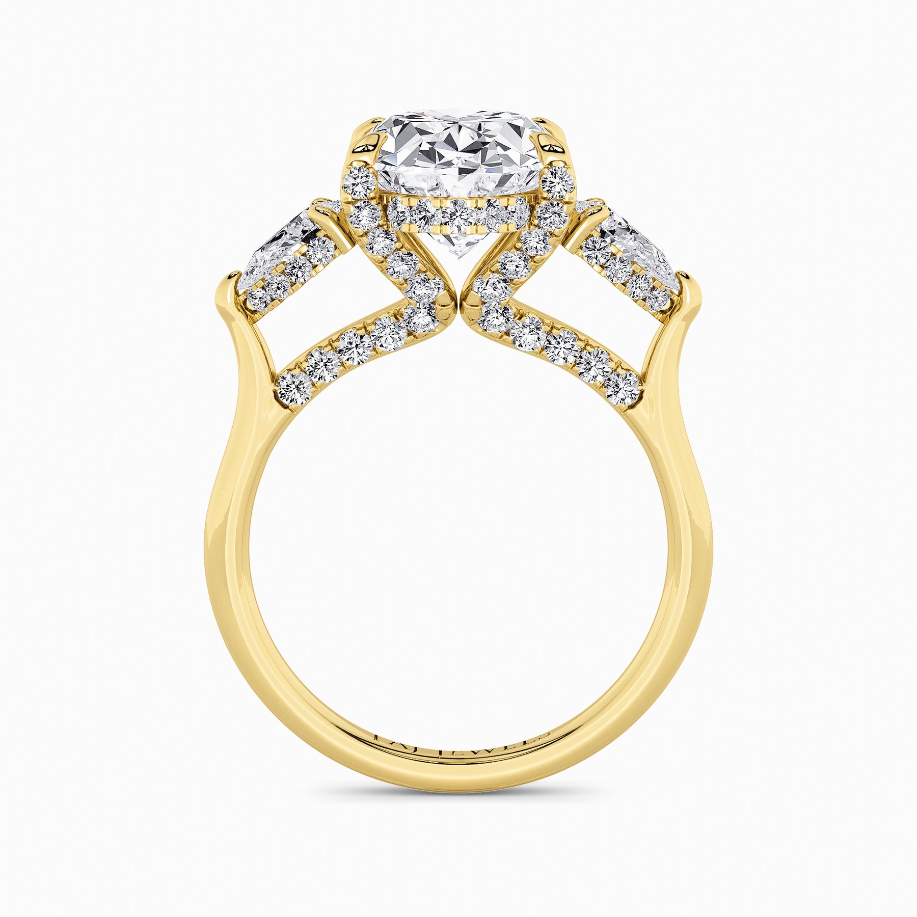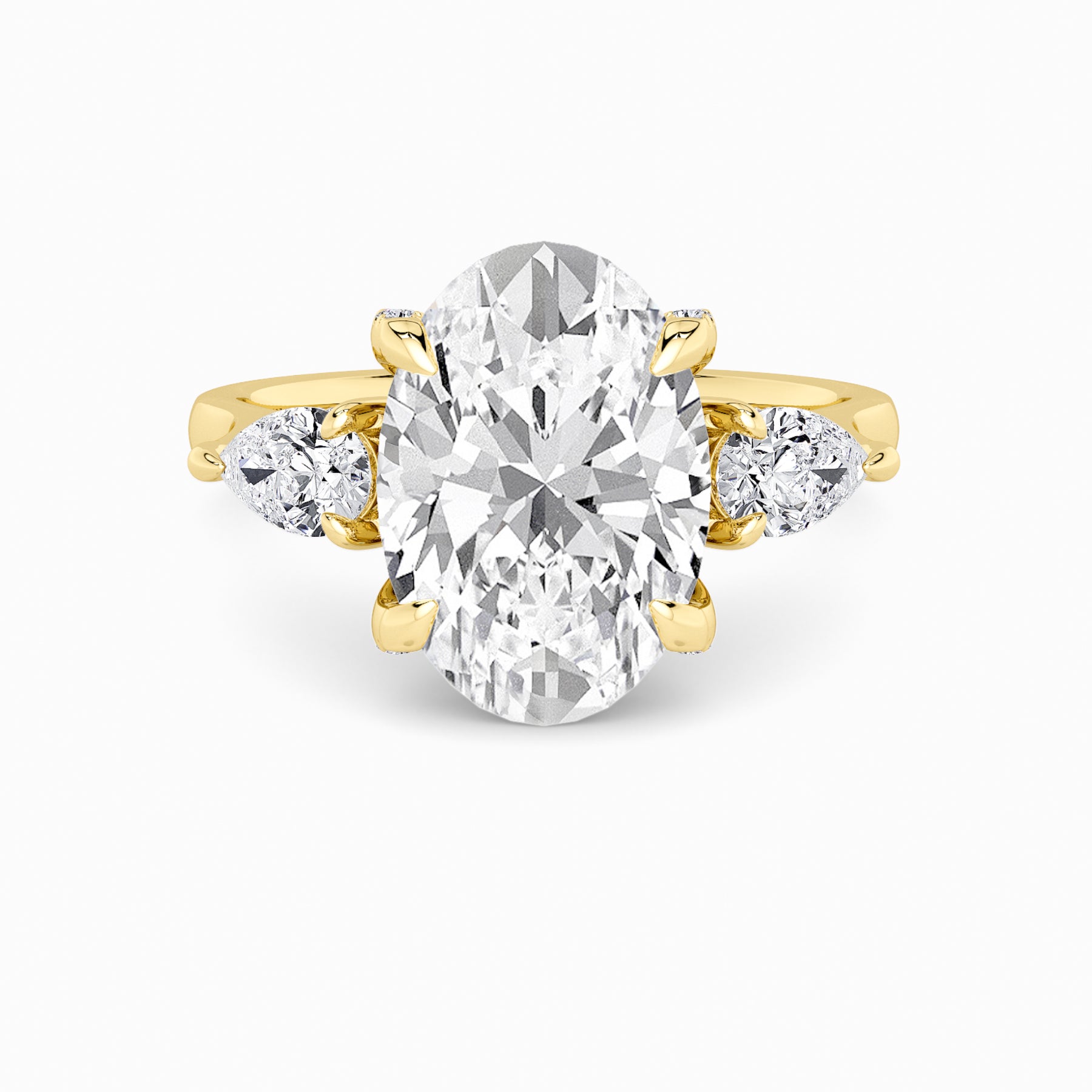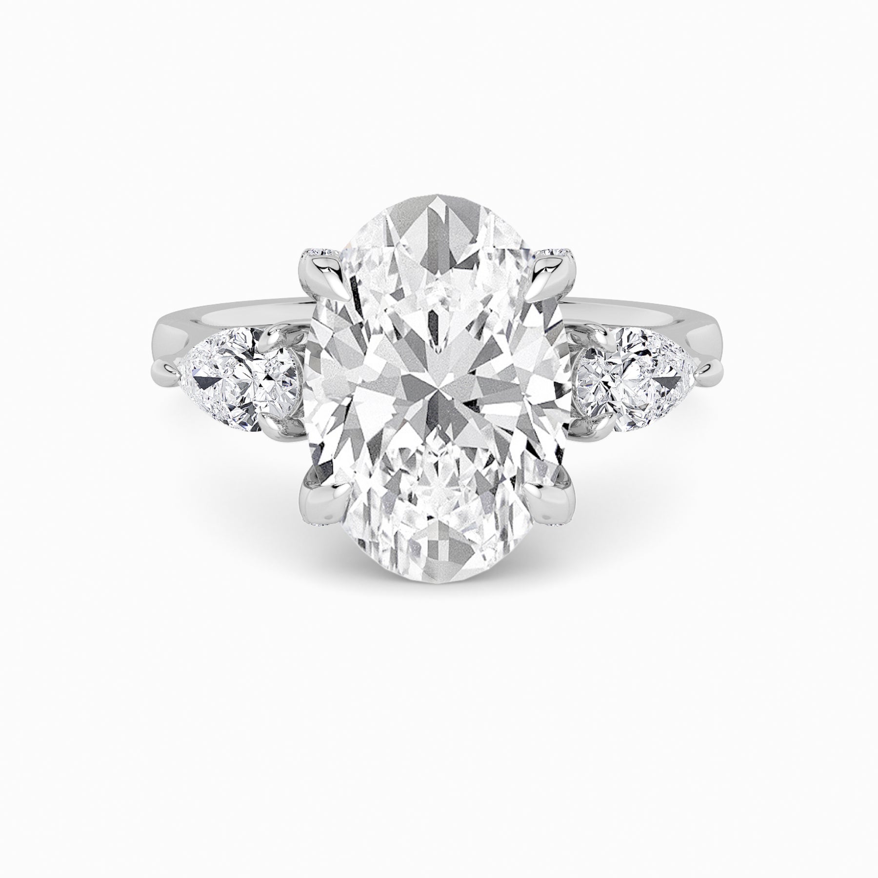 A striking expression of timeless sophistication, this 1.50ct+ Oval Brilliant lab diamond engagement ring is designed to captivate from every angle. The centre stone is elegantly framed by two pear side diamonds, while the elevated setting showcases a beautifully detailed crossover gallery adorned with micro-pavé diamonds. Beneath the centre stone, a discreet diamond-set halo enhances depth, brilliance, and architectural interest without detracting from the centre diamond’s overall presence.