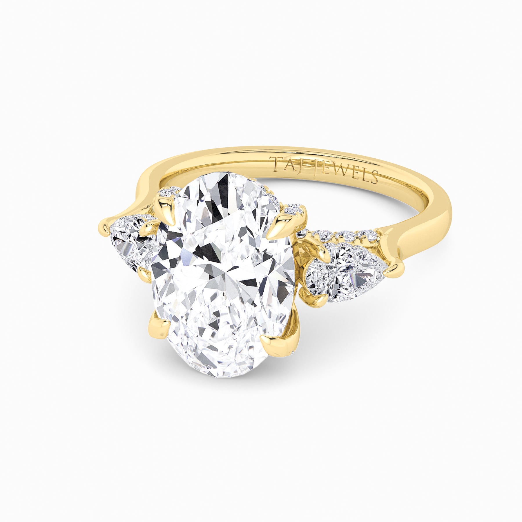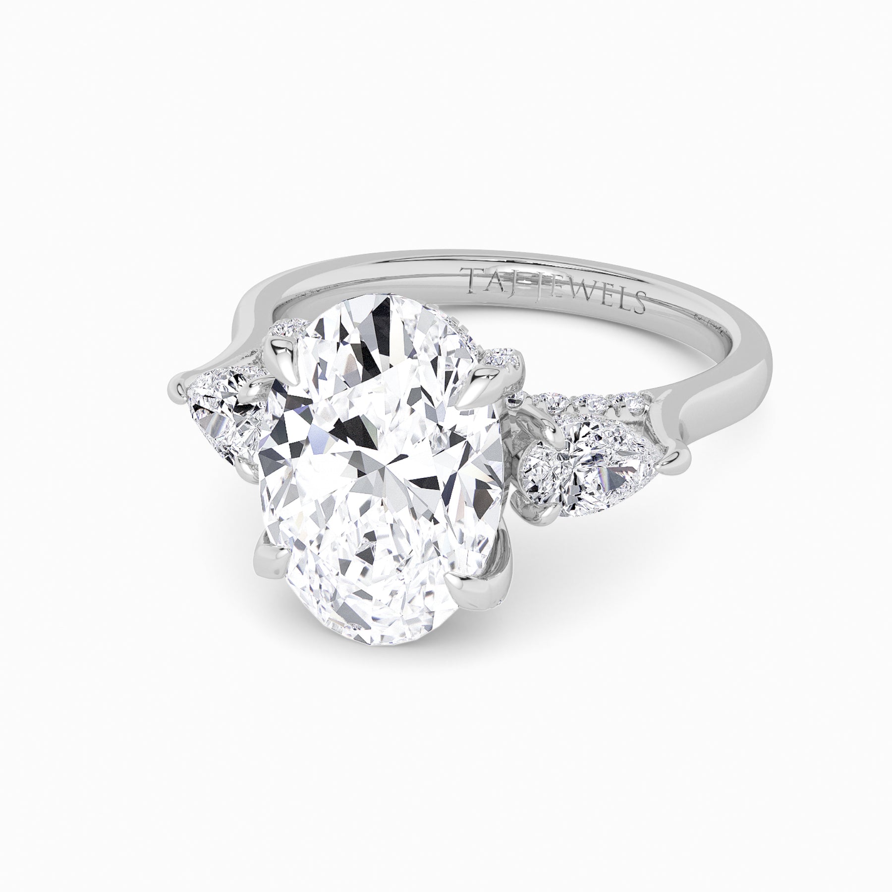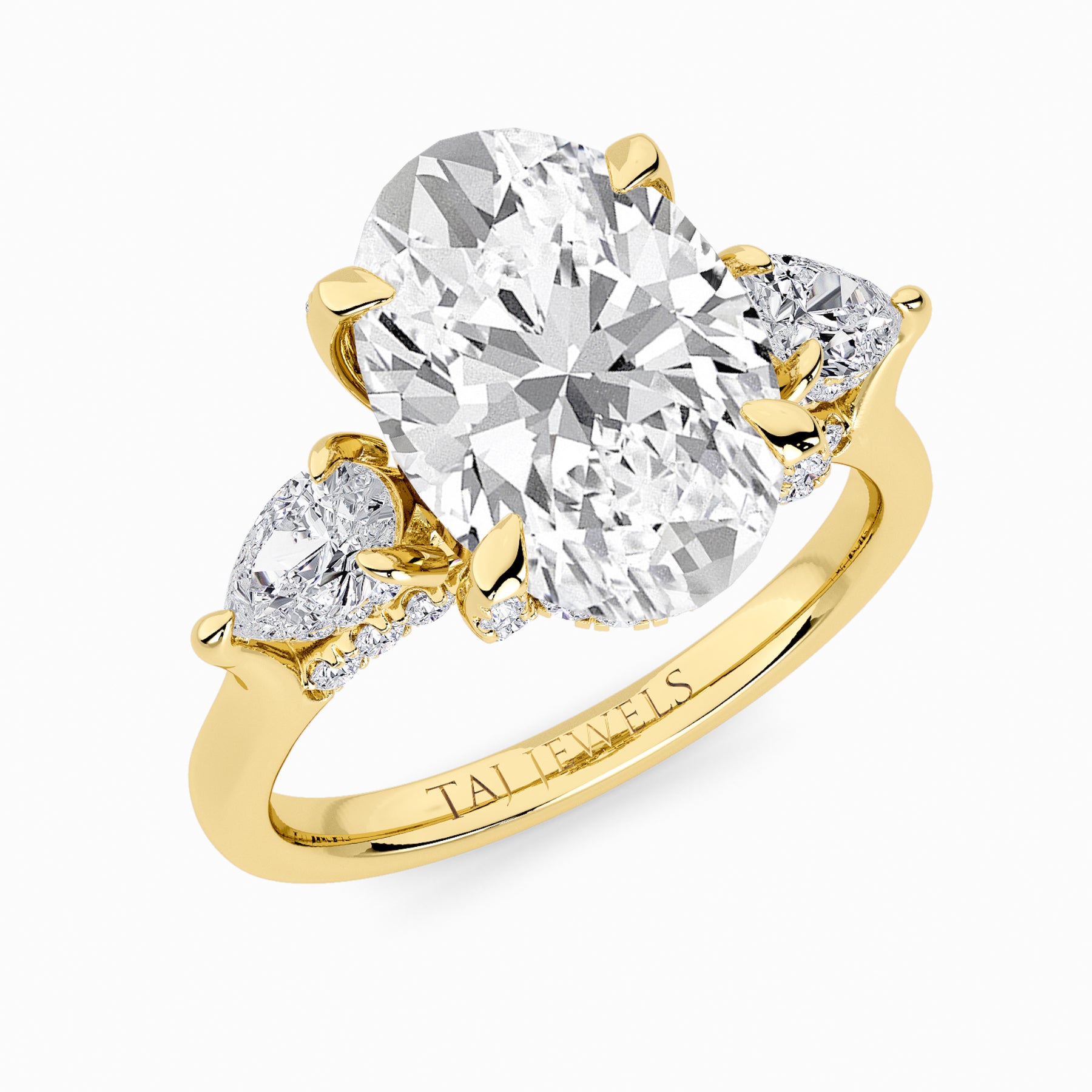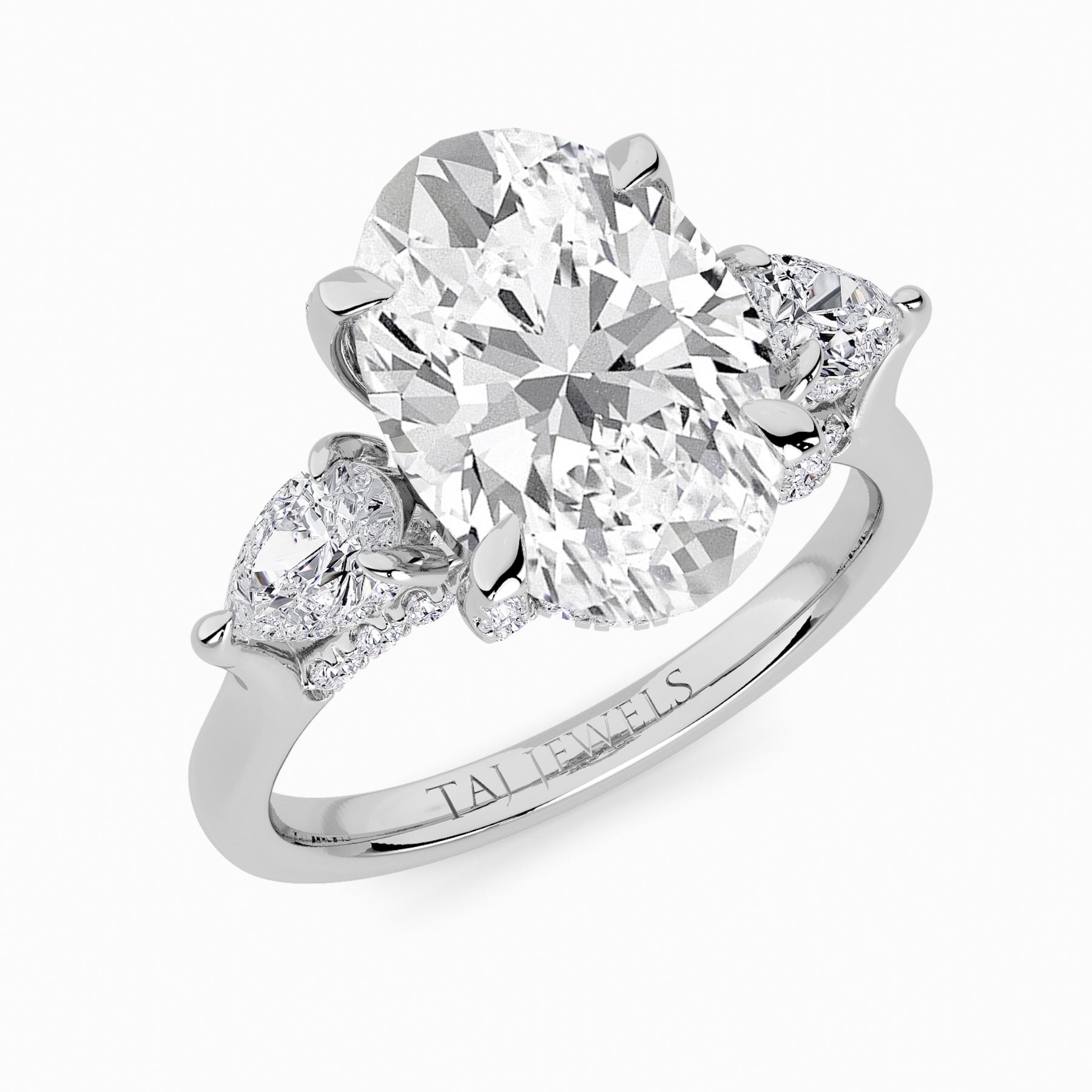A striking expression of timeless sophistication, this 1.50ct+ Oval Brilliant lab diamond engagement ring is designed to captivate from every angle. The centre stone is elegantly framed by two pear side diamonds, while the elevated setting showcases a beautifully detailed crossover gallery adorned with micro-pavé diamonds. Beneath the centre stone, a discreet diamond-set halo enhances depth, brilliance, and architectural interest without detracting from the centre diamond’s overall presence.