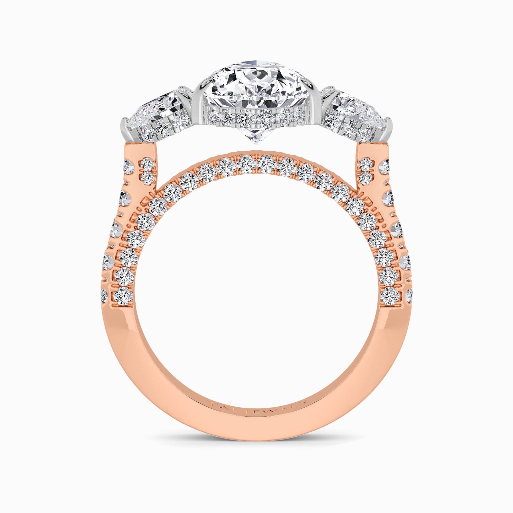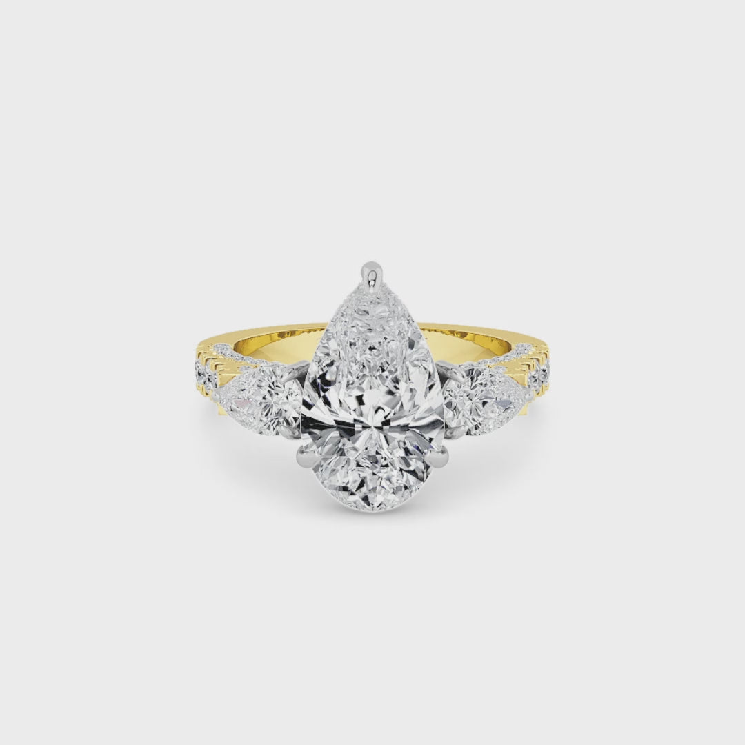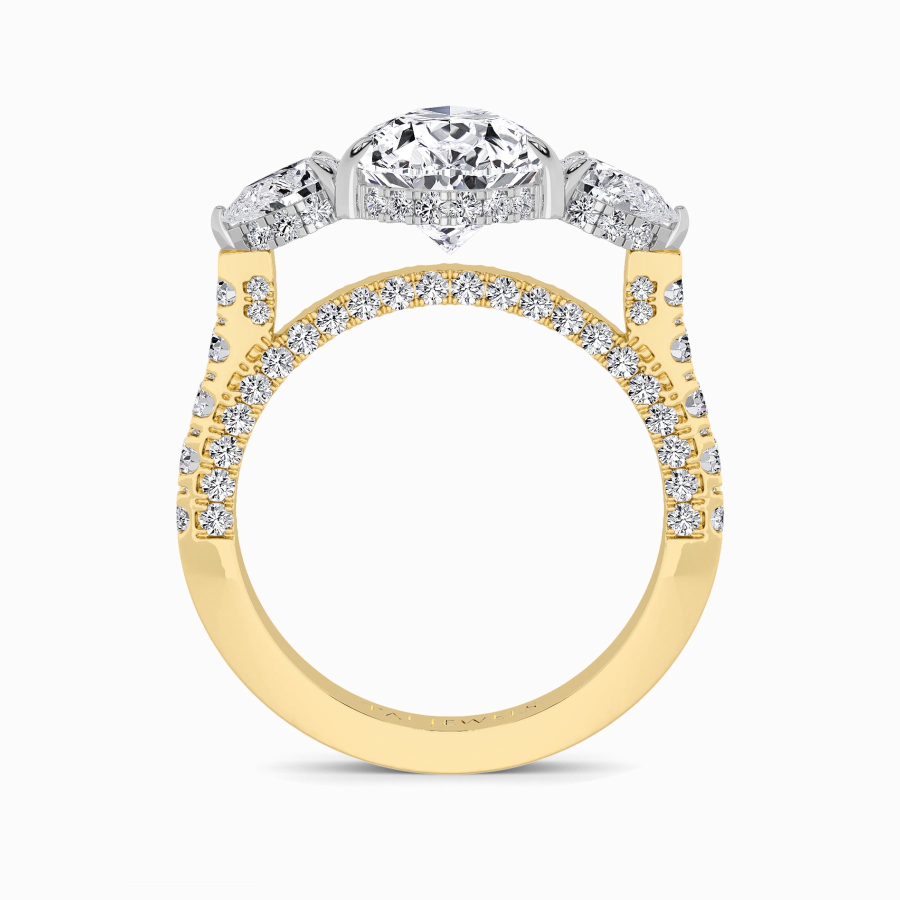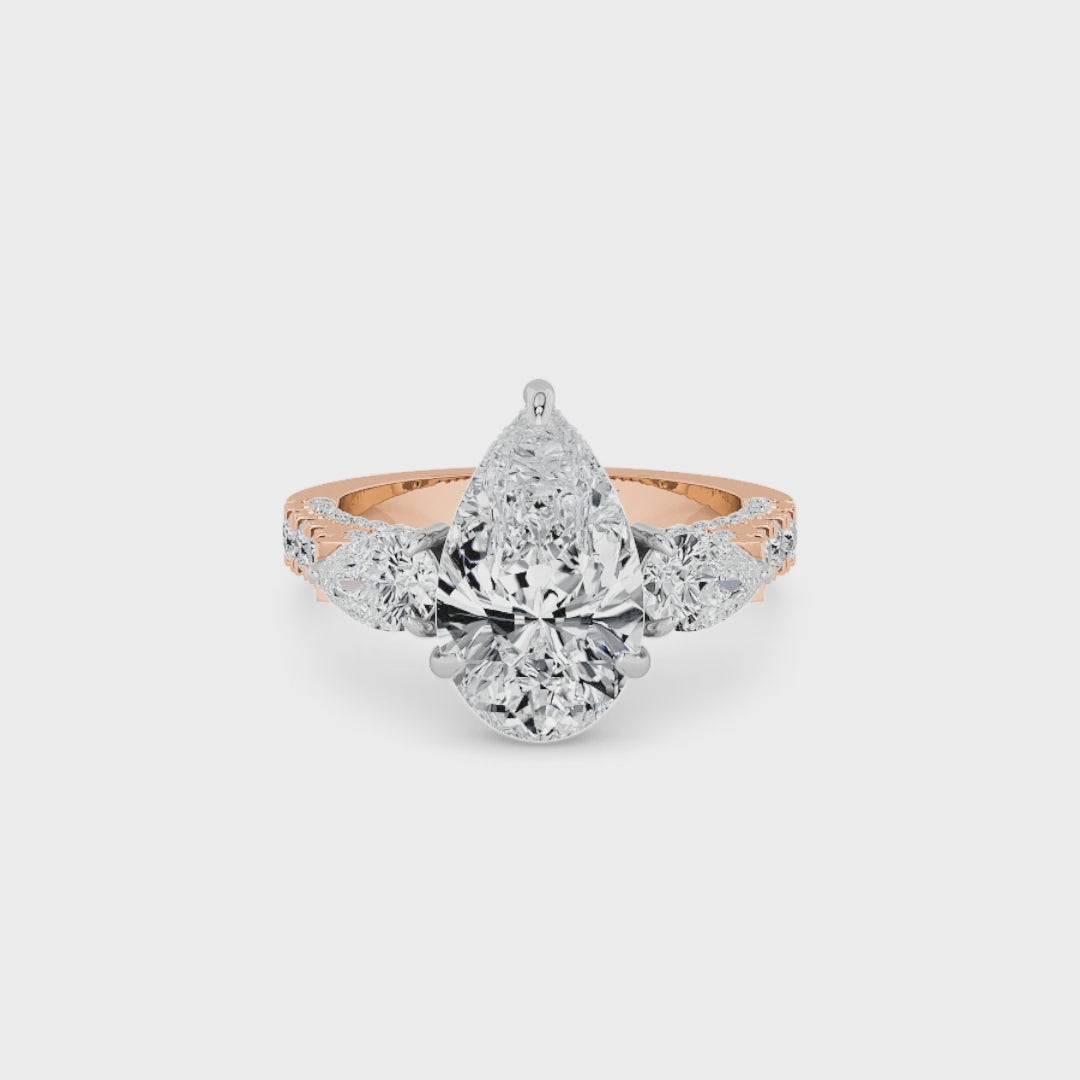 A striking expression of timeless sophistication, this 1.50ct+ Pear cut lab diamond engagement ring is designed to captivate from every angle. The centre stone is elegantly framed by two pear-cut side diamonds, while the elevated setting showcases a beautiful open gallery adorned with 3D pave band. Beneath the centre stone, a discreet diamond-set halo enhances depth, brilliance, and architectural interest without detracting from the centre diamond’s overall presence.