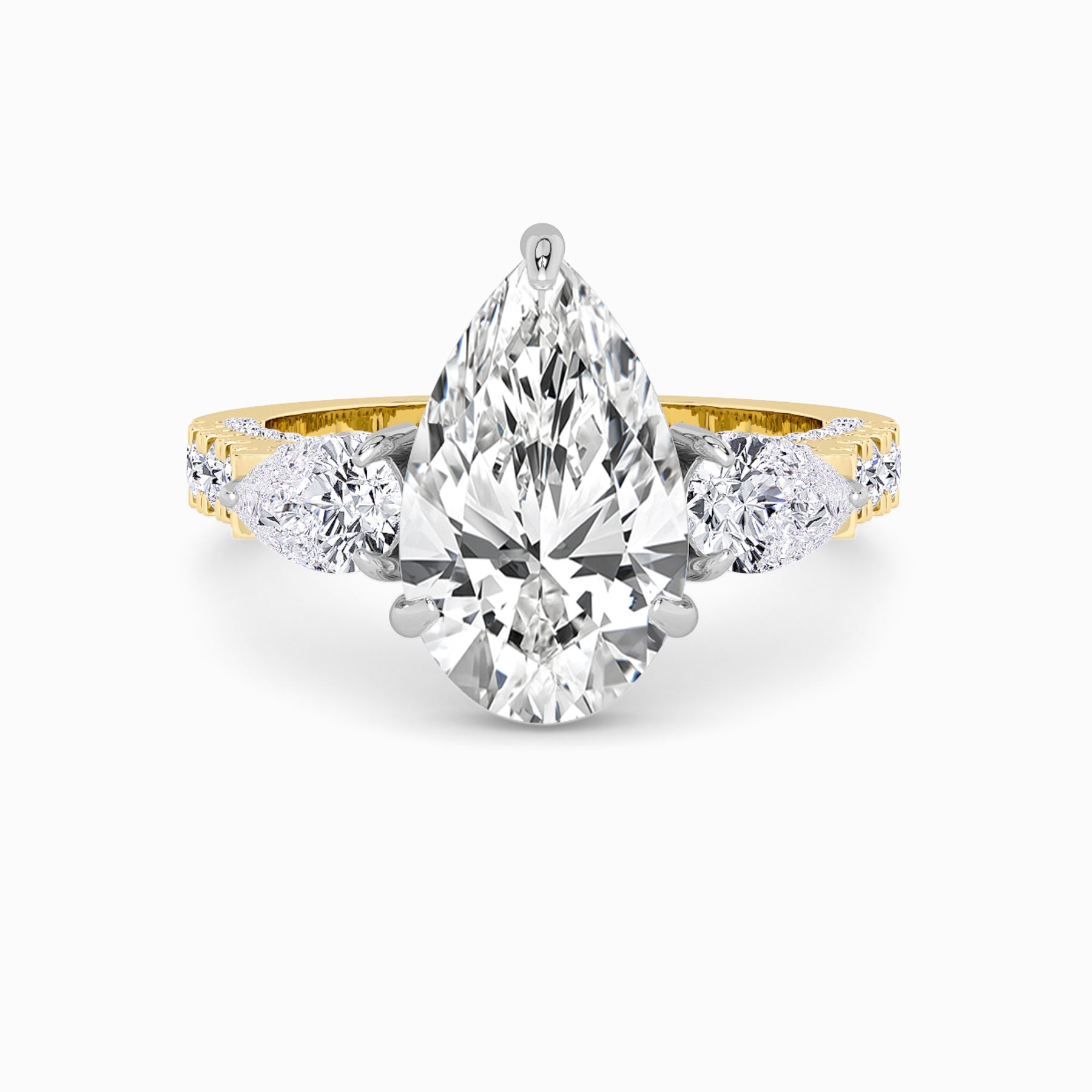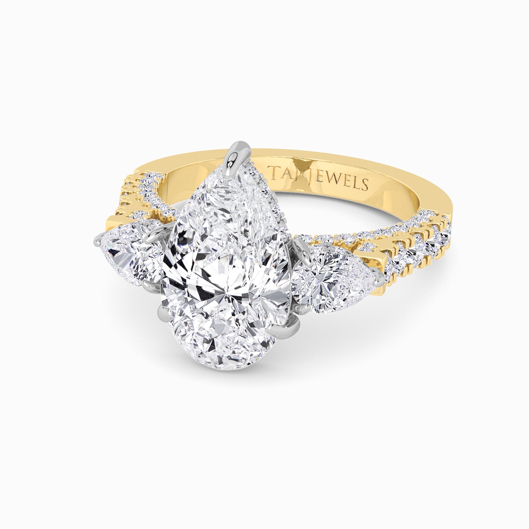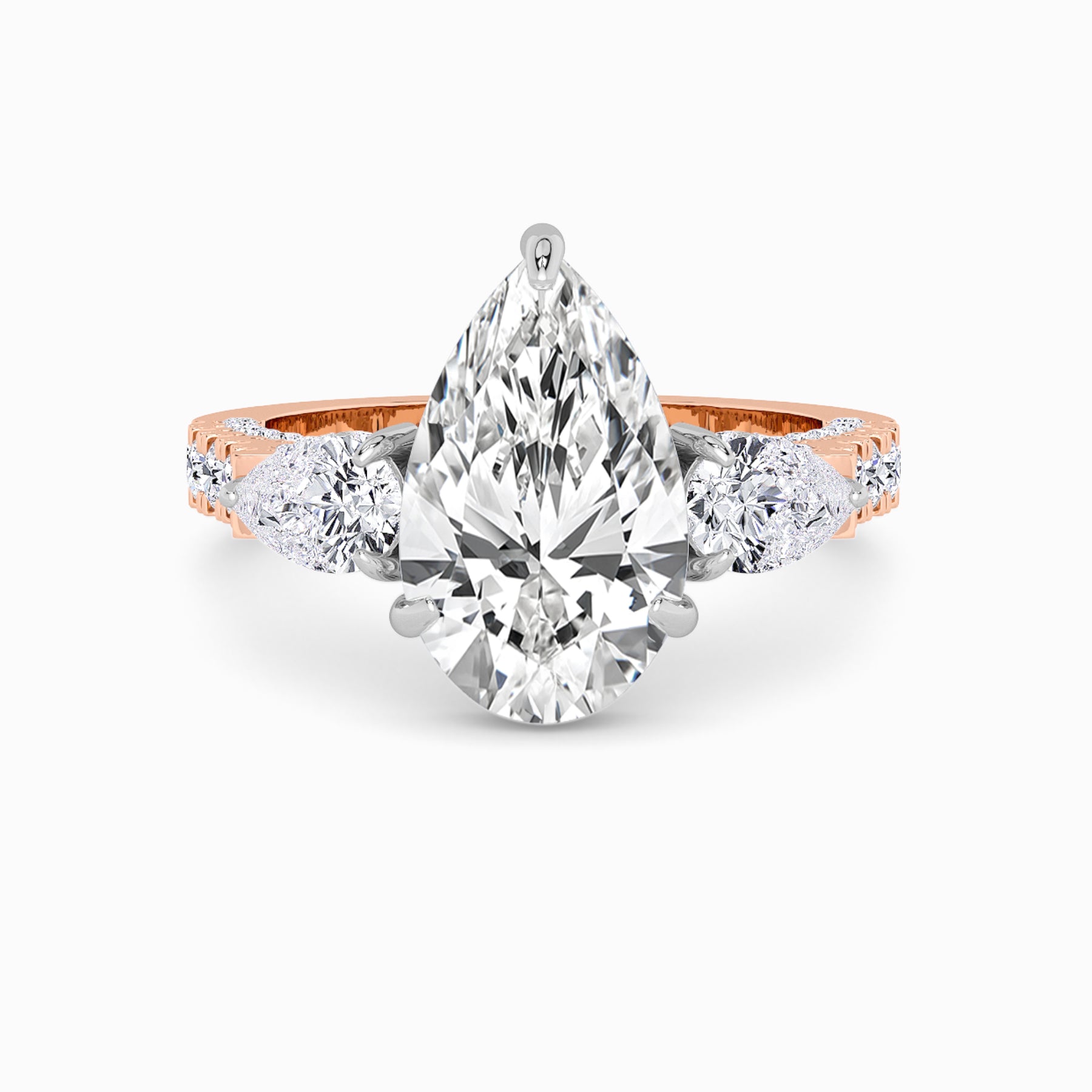 A striking expression of timeless sophistication, this 1.50ct+ Pear cut lab diamond engagement ring is designed to captivate from every angle. The centre stone is elegantly framed by two pear-cut side diamonds, while the elevated setting showcases a beautiful open gallery adorned with 3D pave band. Beneath the centre stone, a discreet diamond-set halo enhances depth, brilliance, and architectural interest without detracting from the centre diamond’s overall presence.
