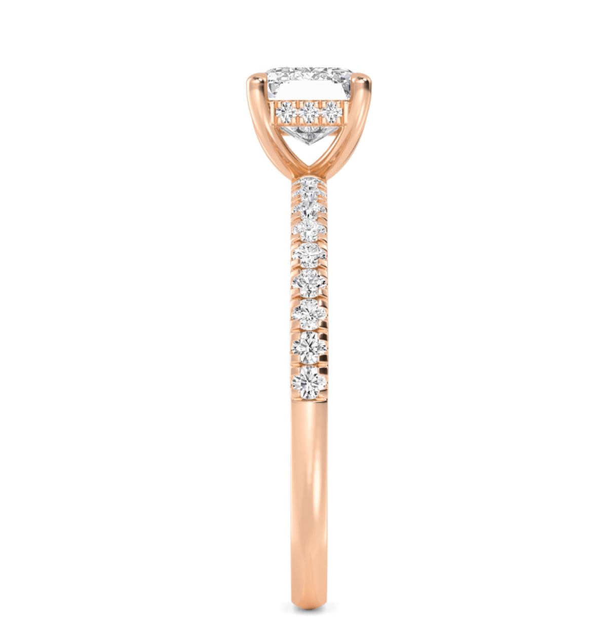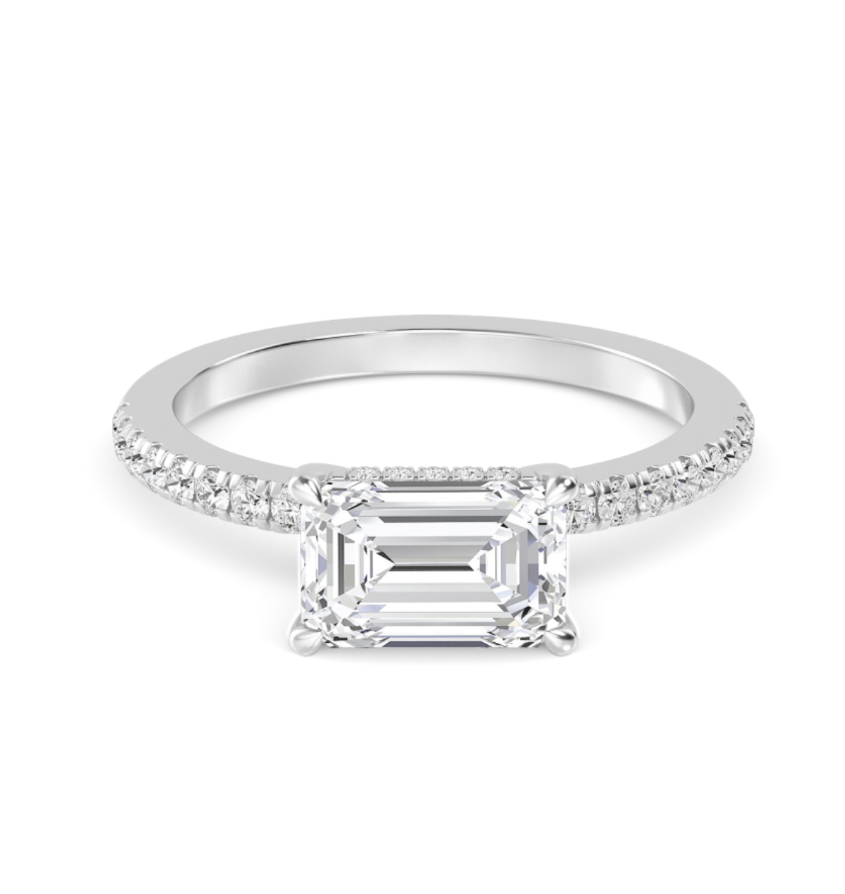 Presenting our gorgeous 1.00ct+ IGI Certified Centre Lab-Grown Emerald Cut Lab Diamond East West Engagement Ring set on a stunning Floating Head Setting with diamond shoulder and adorned with a hidden halo.