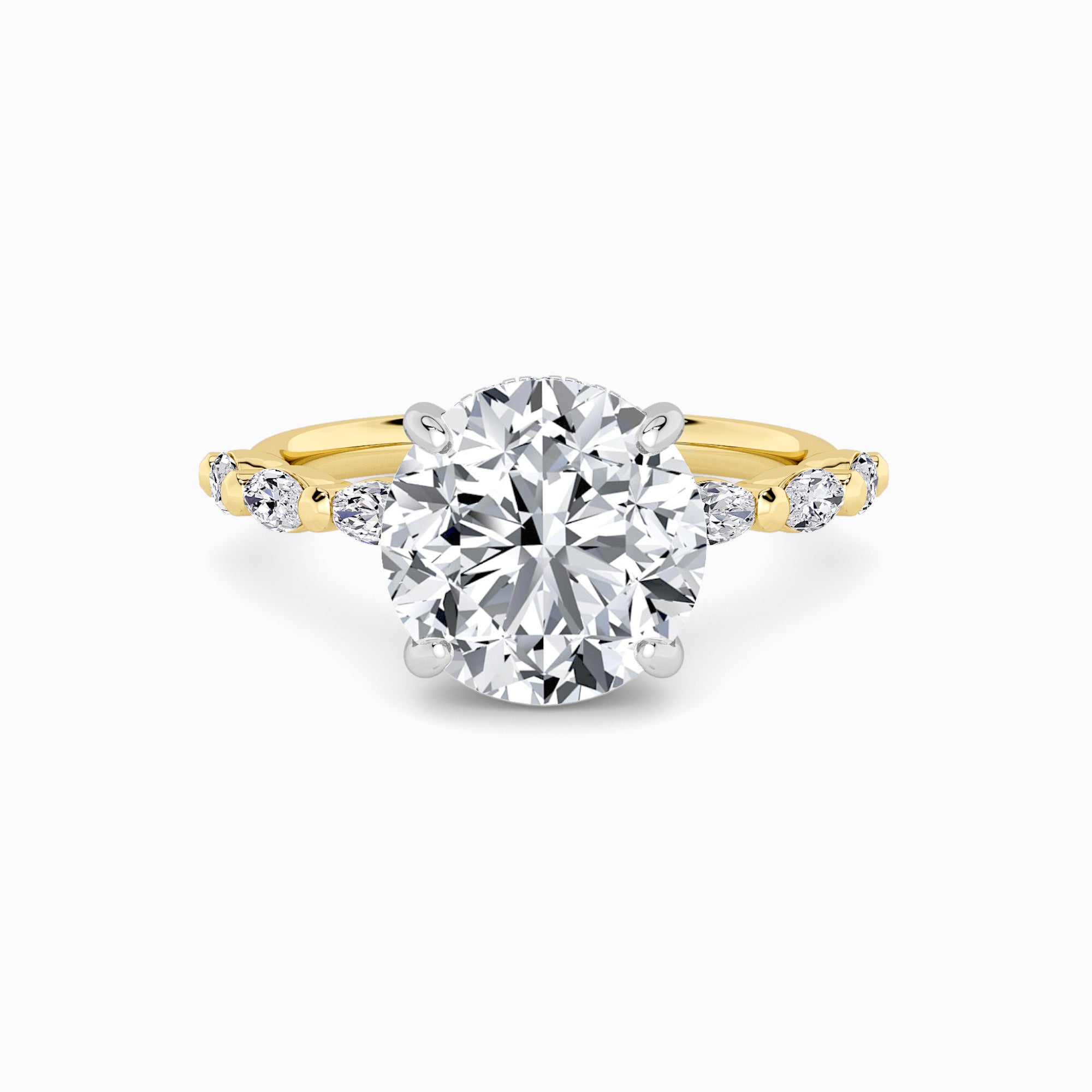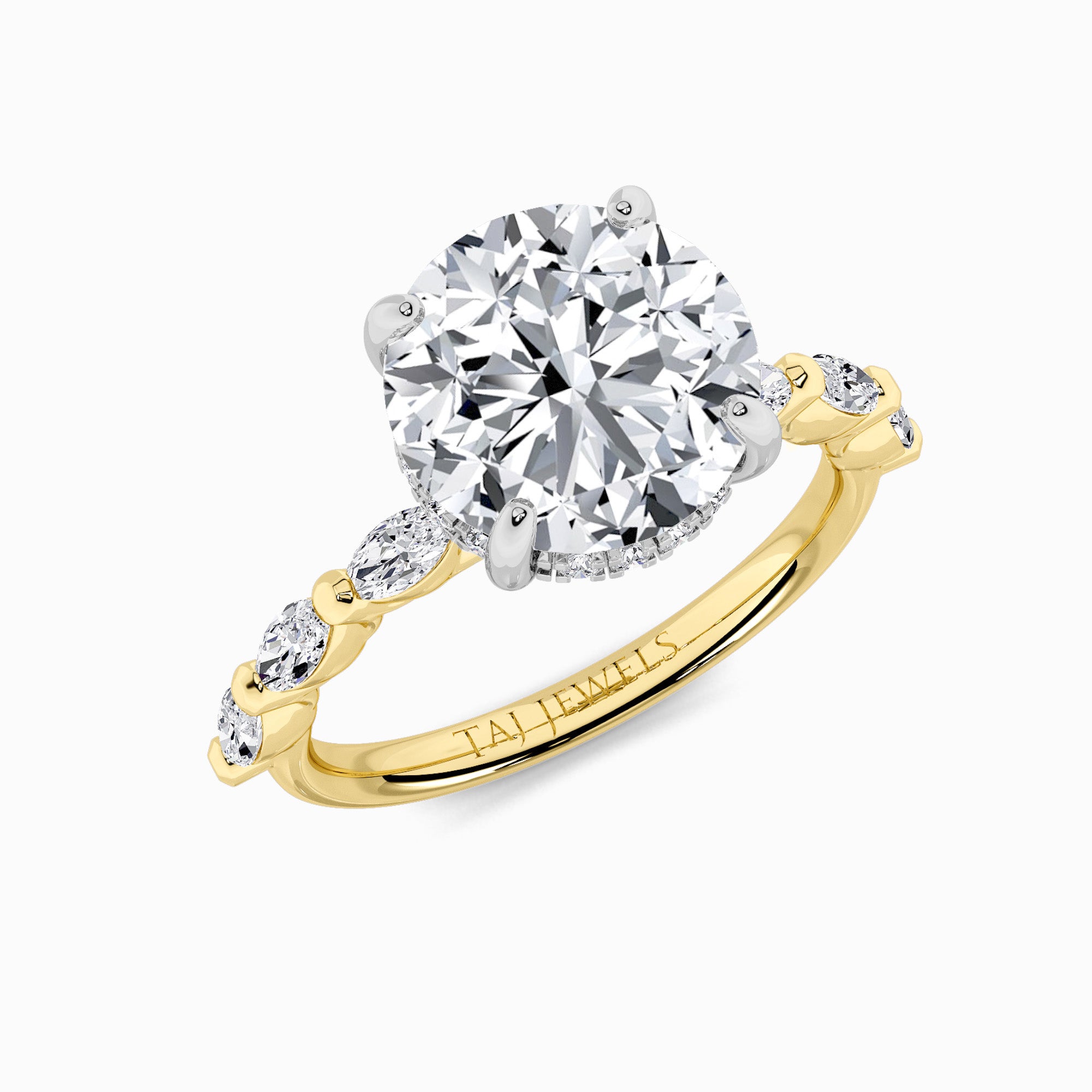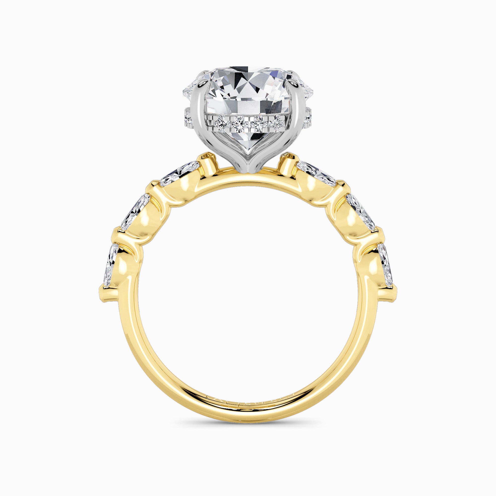 Presenting our gorgeous and classic 1.00ct+ IGI Certified Centre Lab-Grown Round Brilliant Cut Solitaire Floating Head Lab Diamond Engagement Ring set on a Shared ProngMarquise DiamondBand and adorned with a hidden halo.
