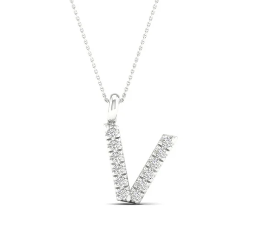 Show off the ultimate fashionista style with this stunning 0.10 ctw (approx.) “V” Initial Pendant, crafted with lab-grown diamonds of VVS clarity and E-F colour.